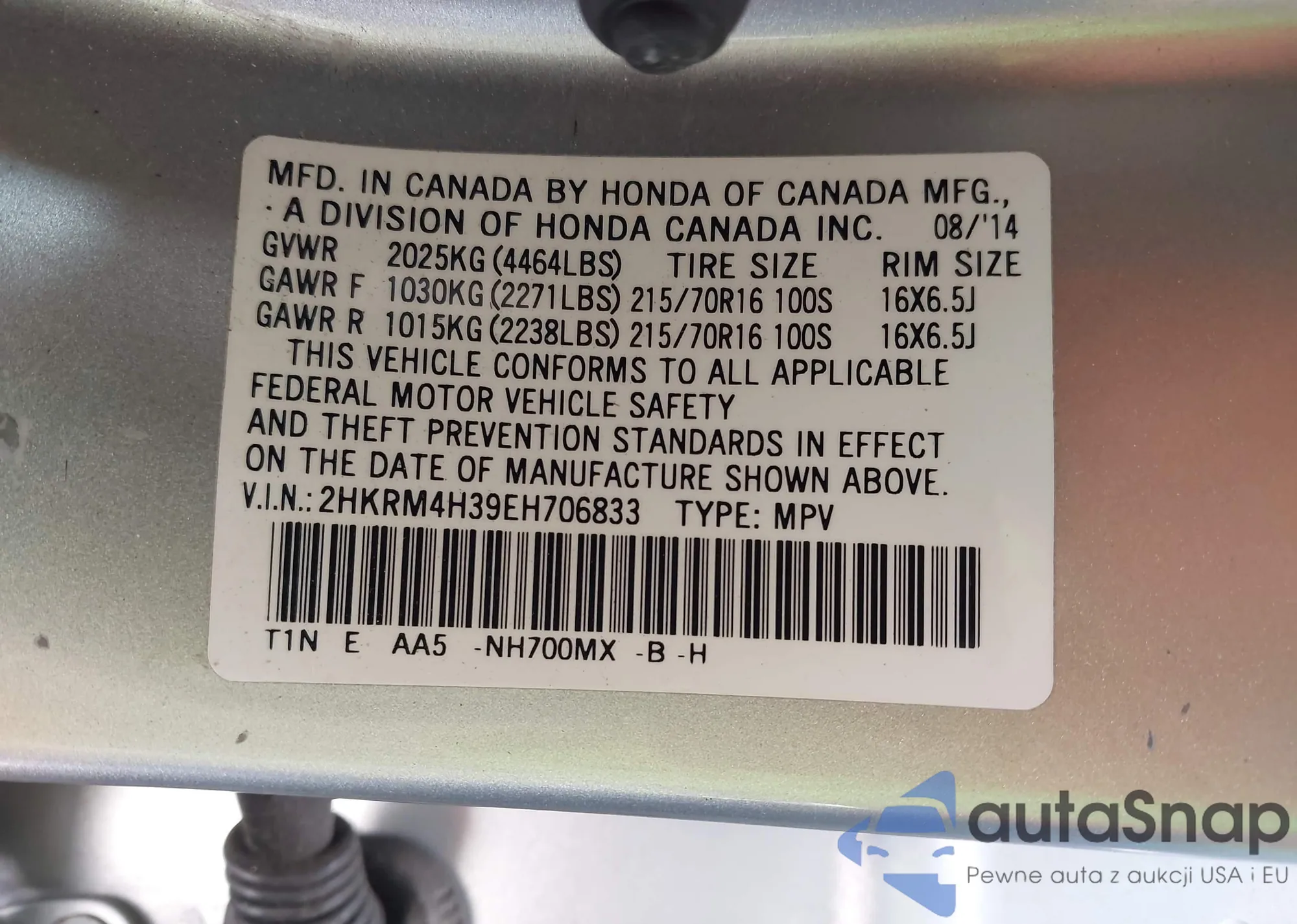 • VIN 2HKRM4H71GH605422