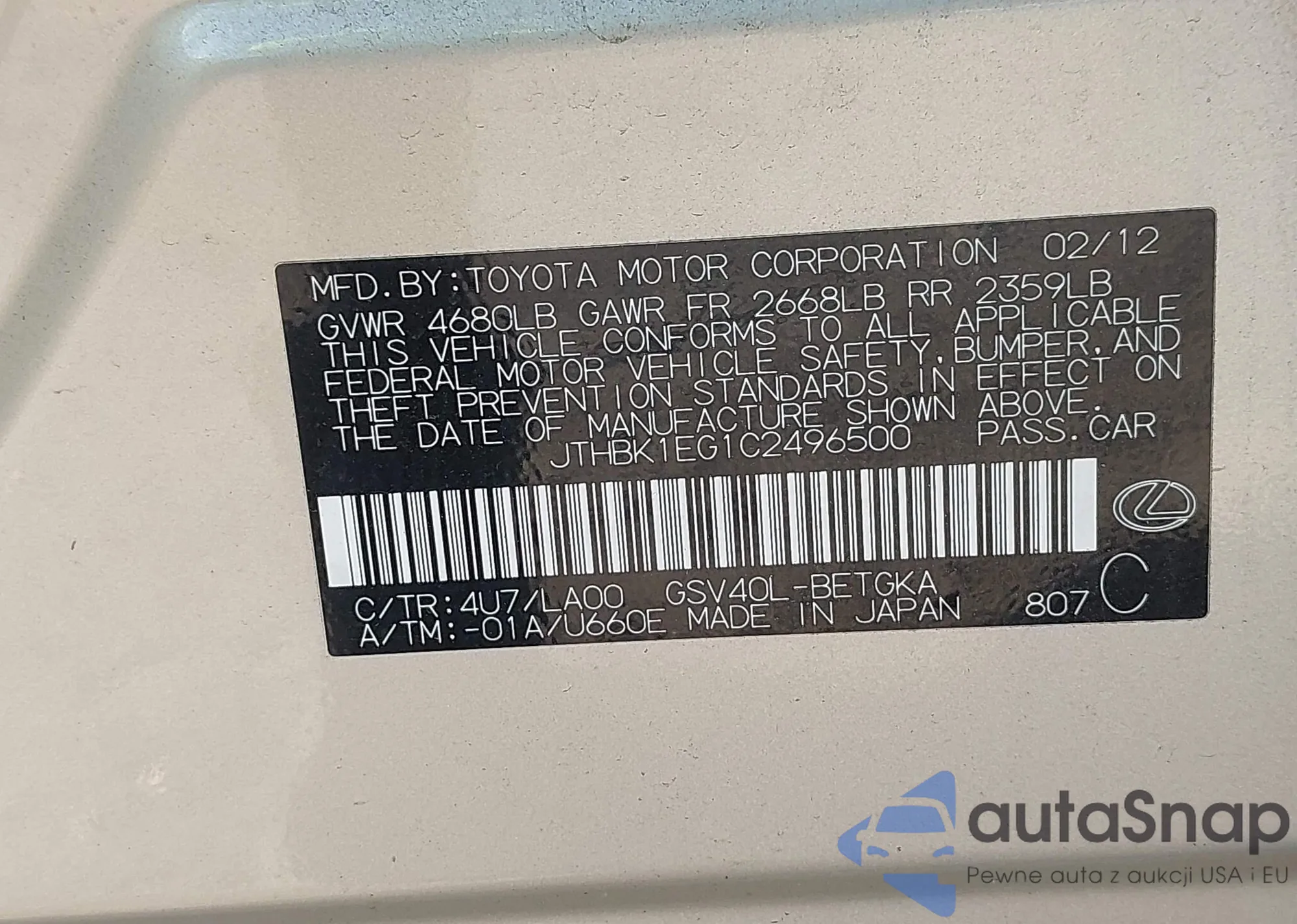 LOT: 42775845 VIN: JTHBK1EG1C2496500