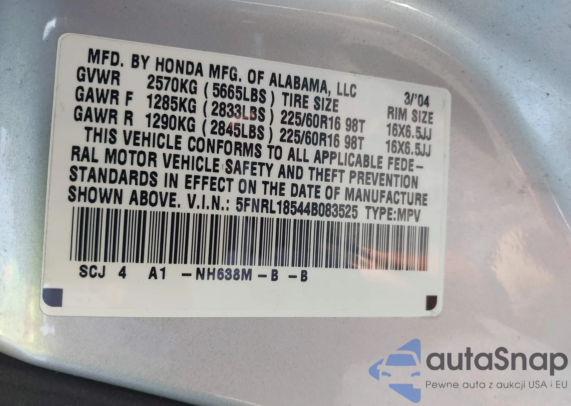 • VIN 5FNRL18544B083525