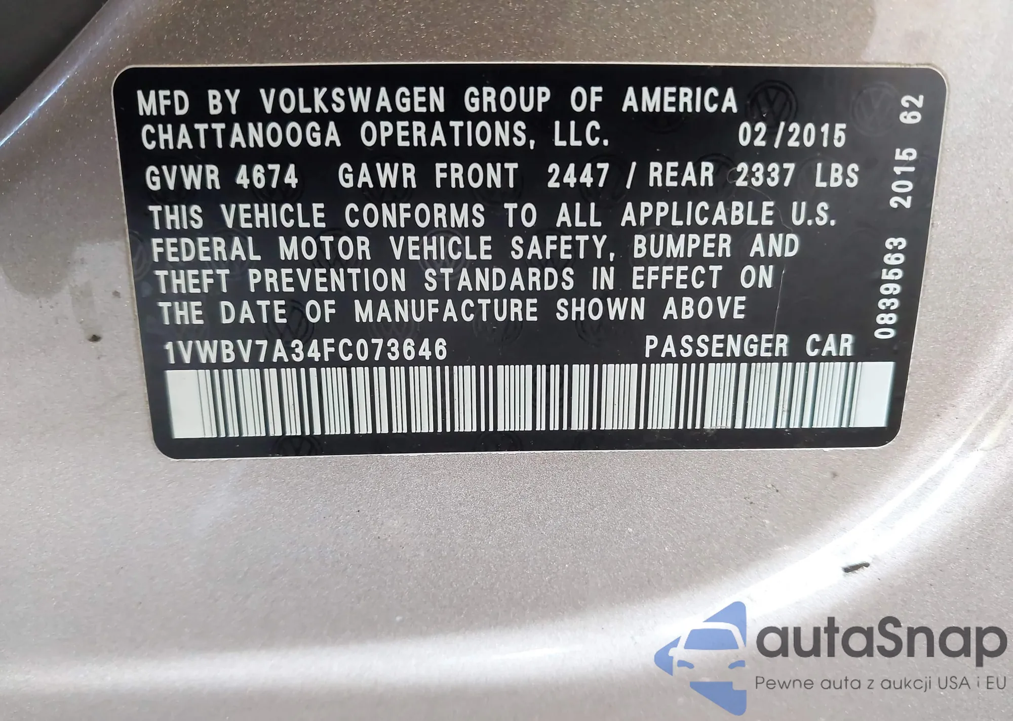LOT: 42334373 VIN: 1VWBV7A34FC073646