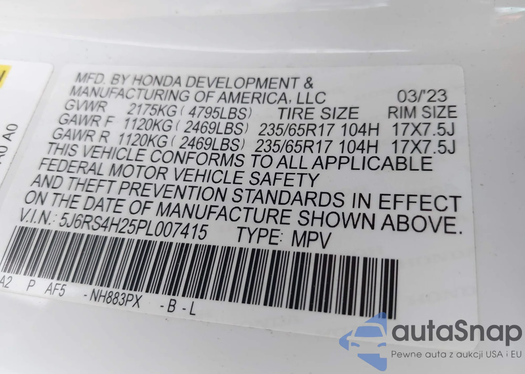 • VIN 5J6RS4H25PL007415