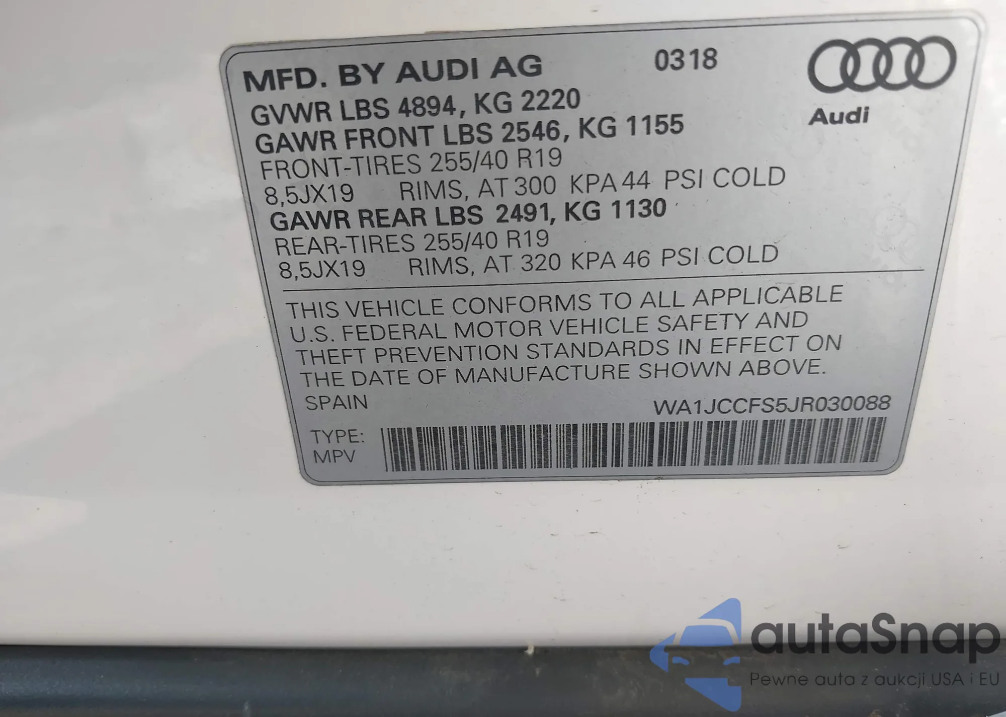 LOT: 42703057 VIN: WA1JCCFS5JR030088