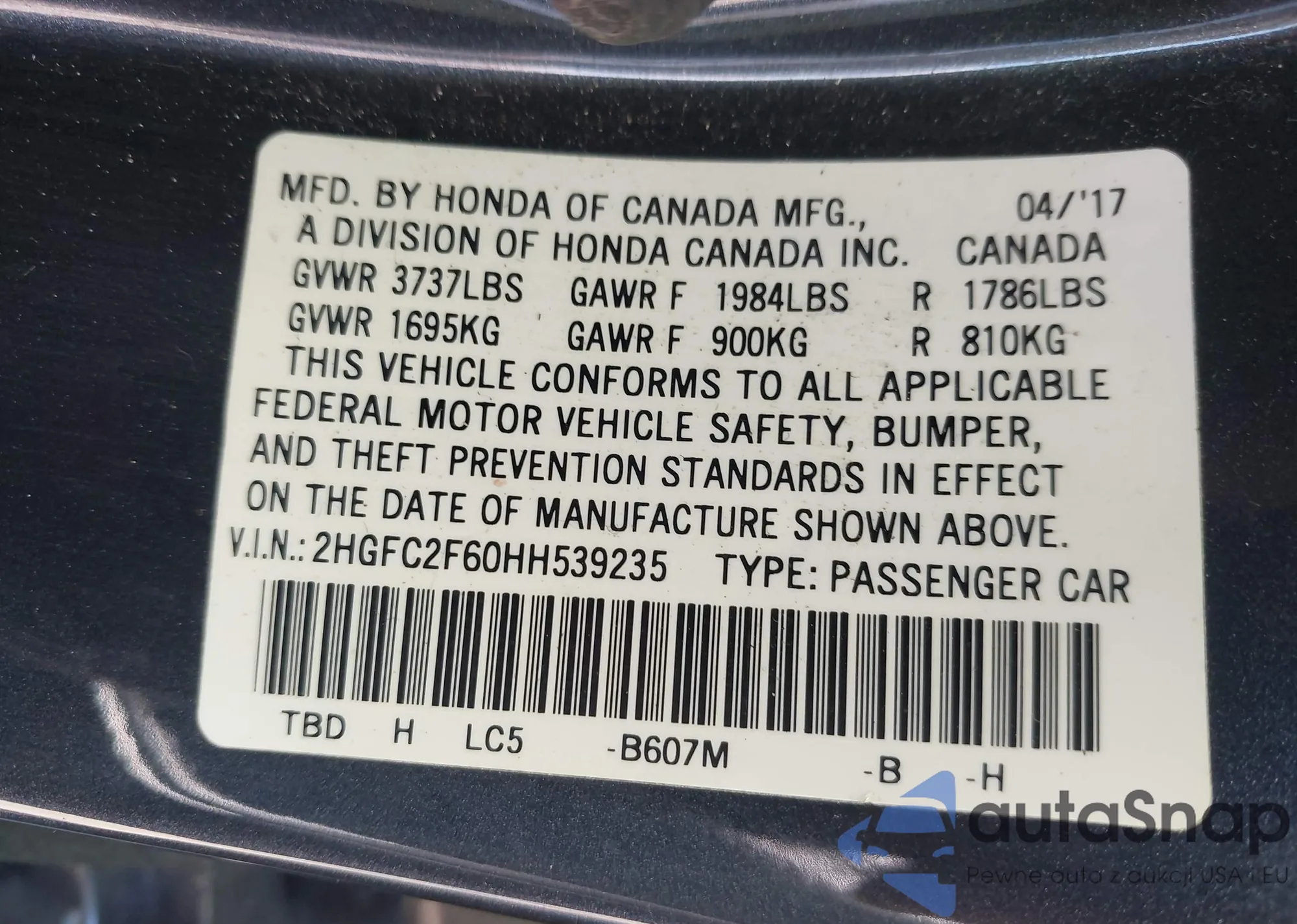 • VIN 2HGFC2F60HH539235