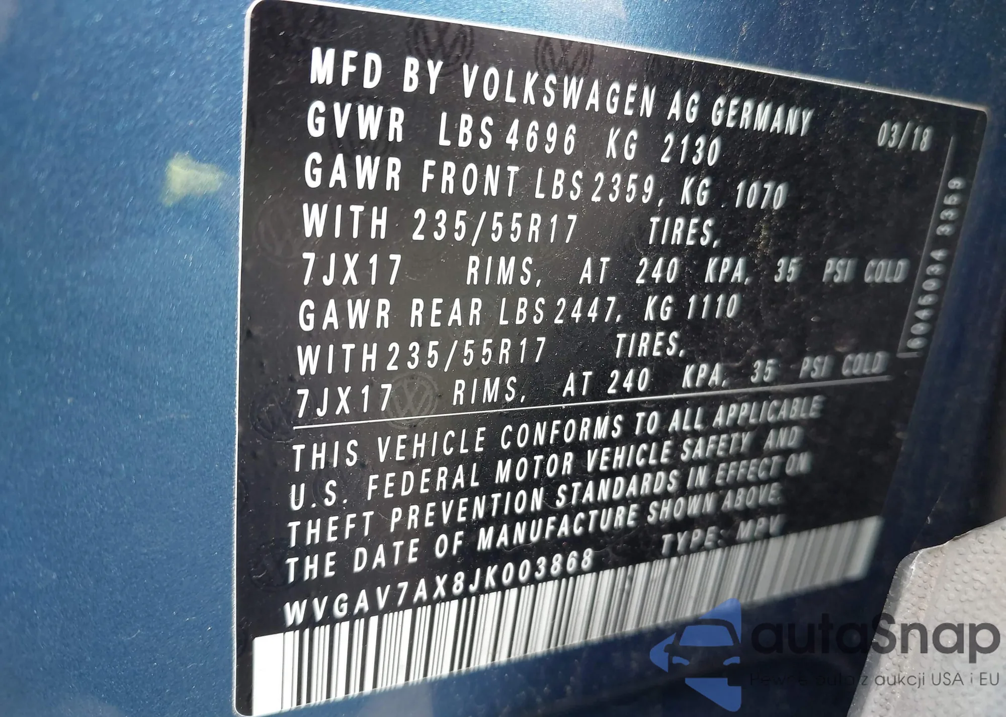 • VIN WVGAV7AX8JK003868