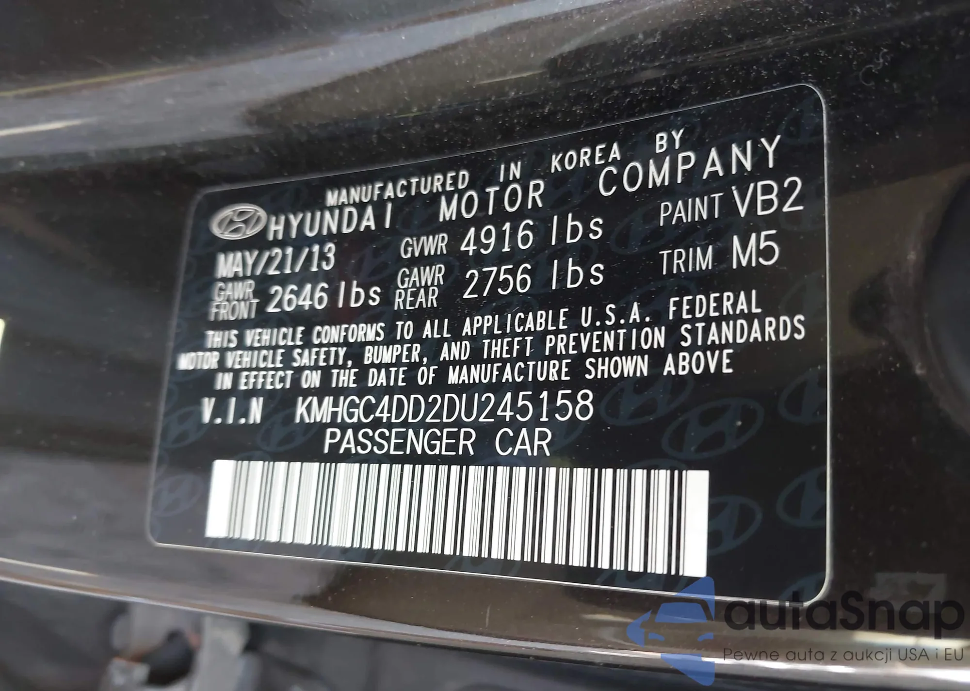 LOT: 42495302 VIN: KMHGC4DD2DU245158