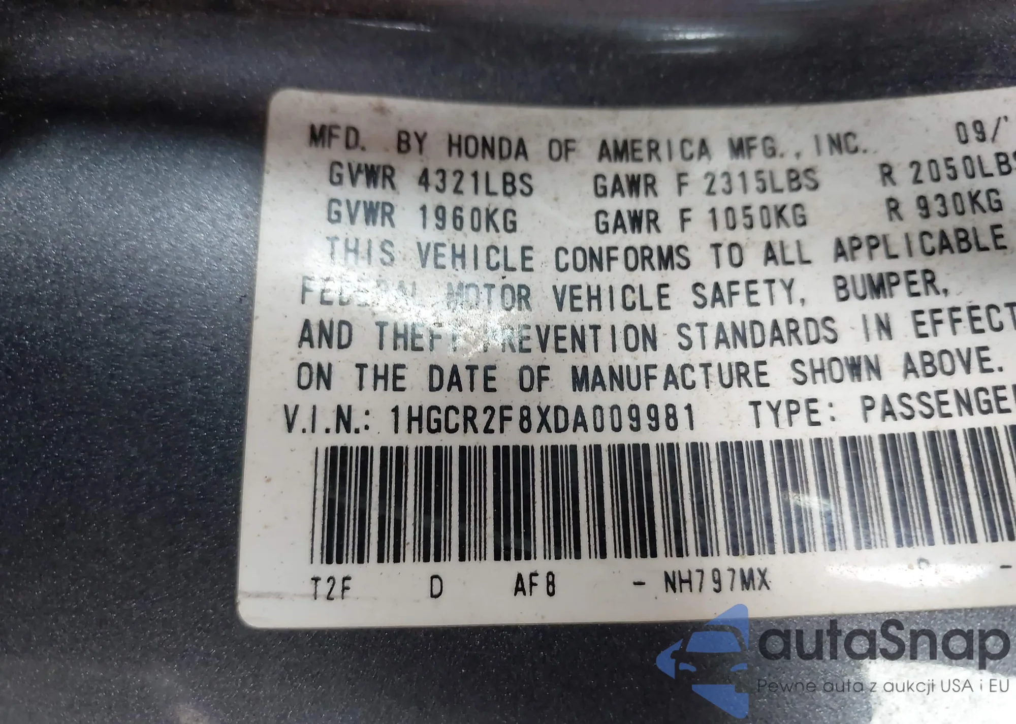 • VIN 1HGCR2F8XDA009981
