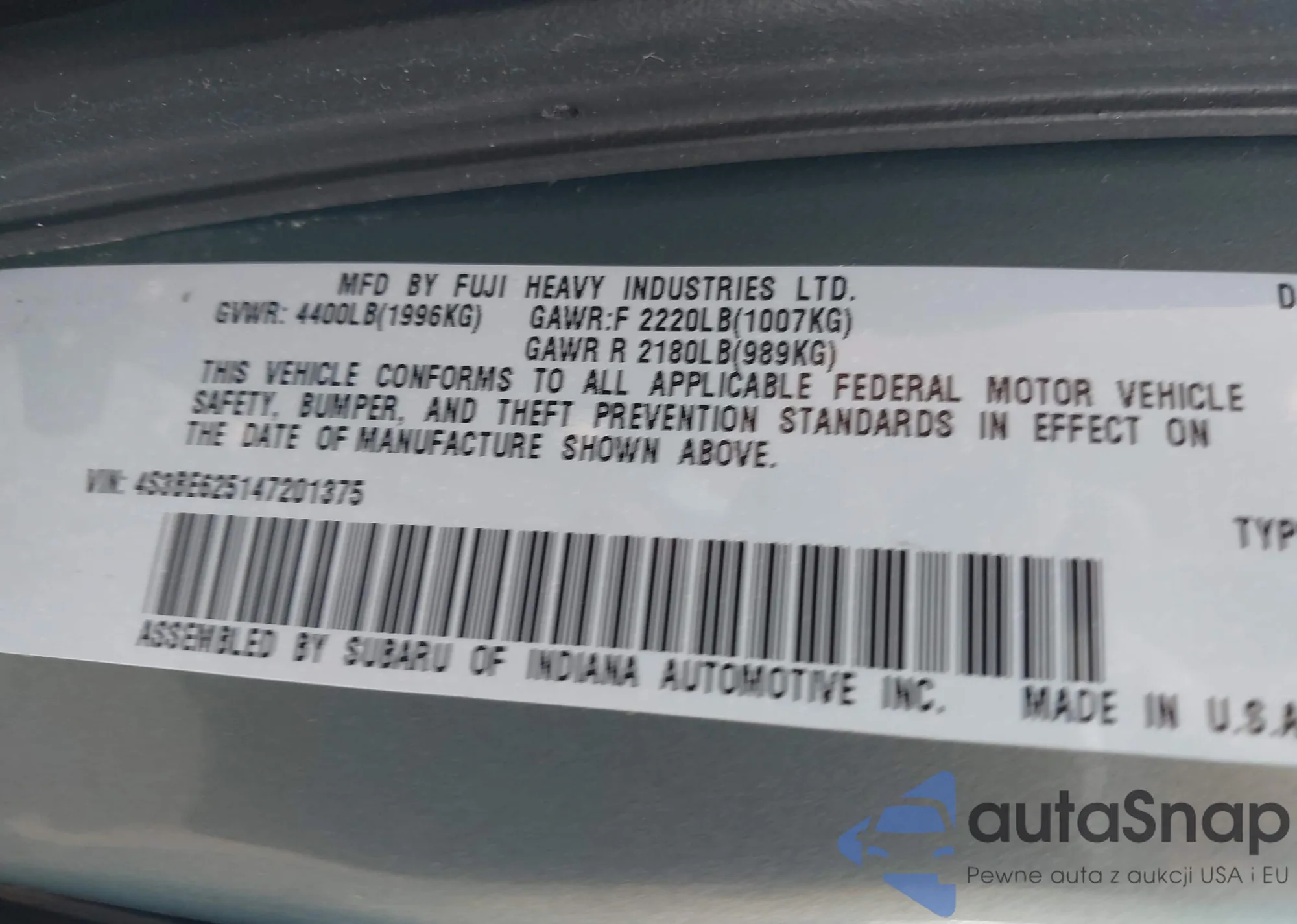• VIN 4S3BE625147201375