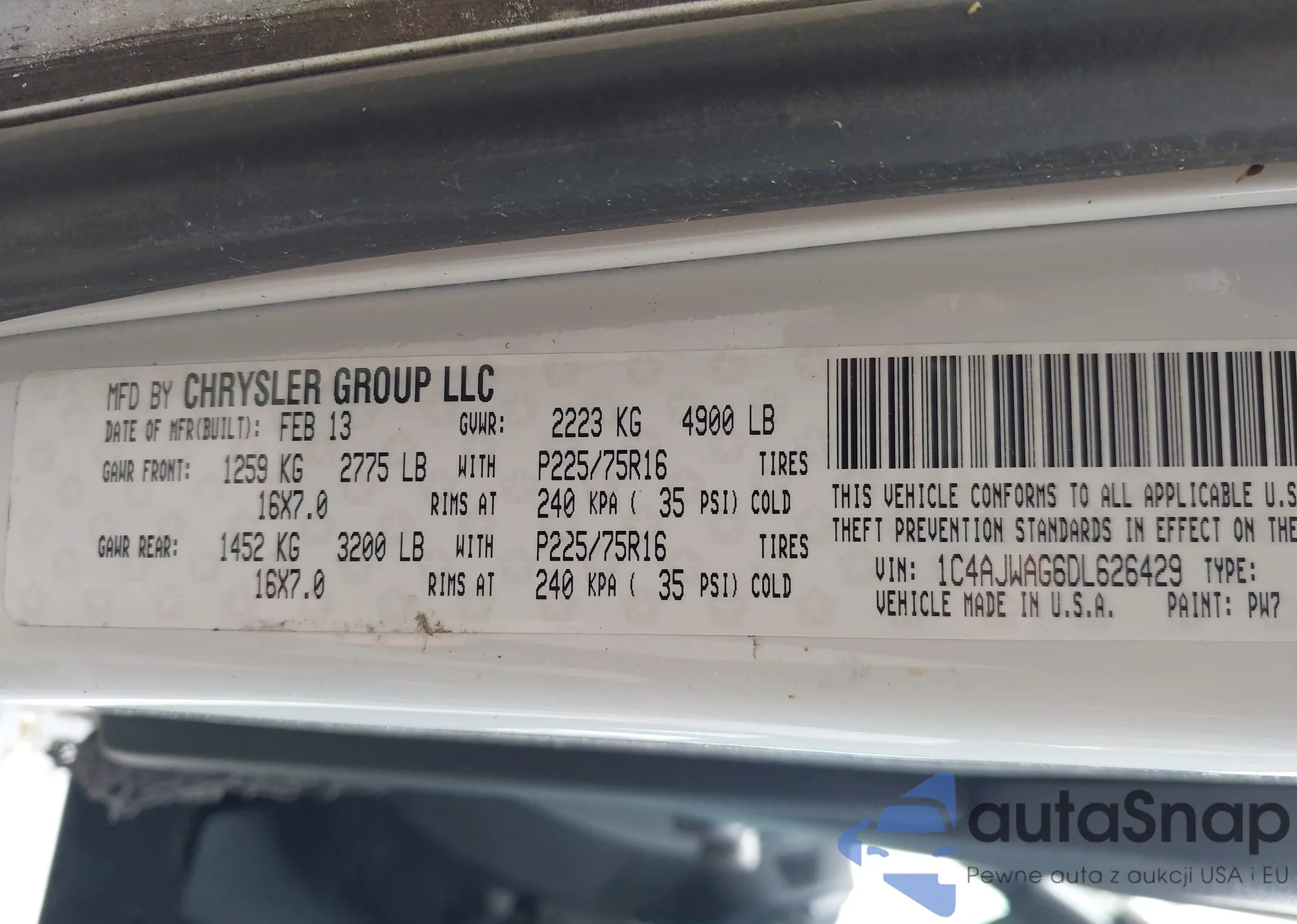 • VIN 1C4AJWAG6DL626429