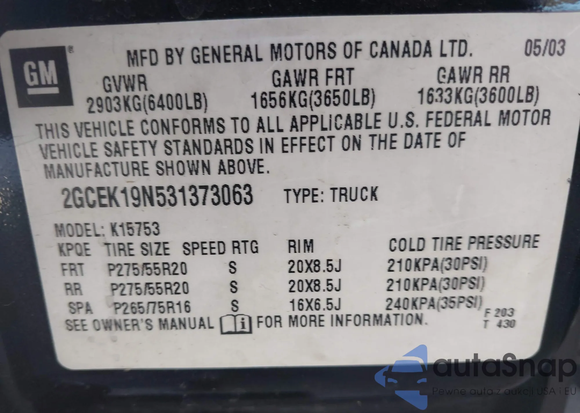 • VIN 2GCEK19N531373063