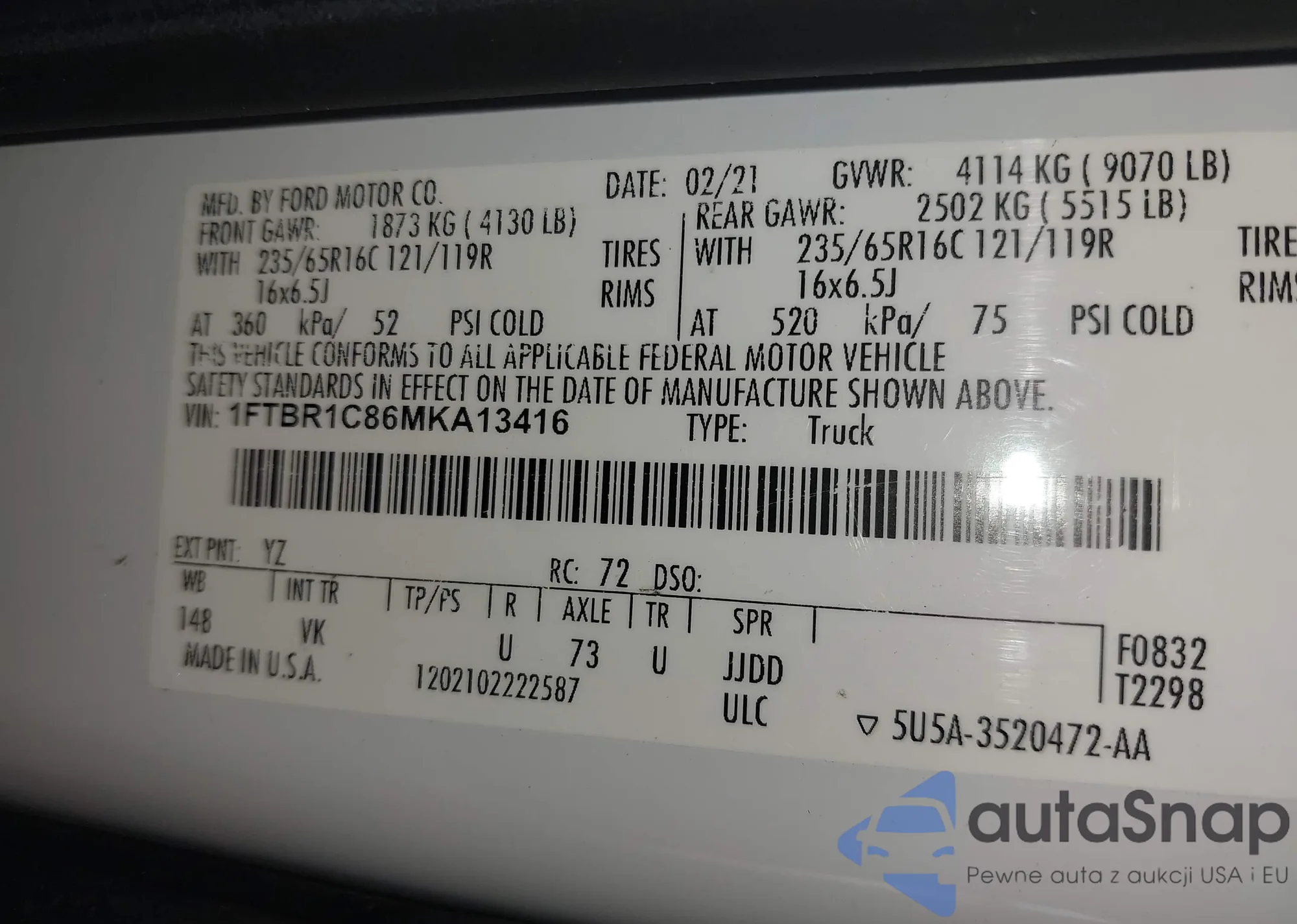 LOT: 42561551 VIN: 1FTBR1C86MKA13416
