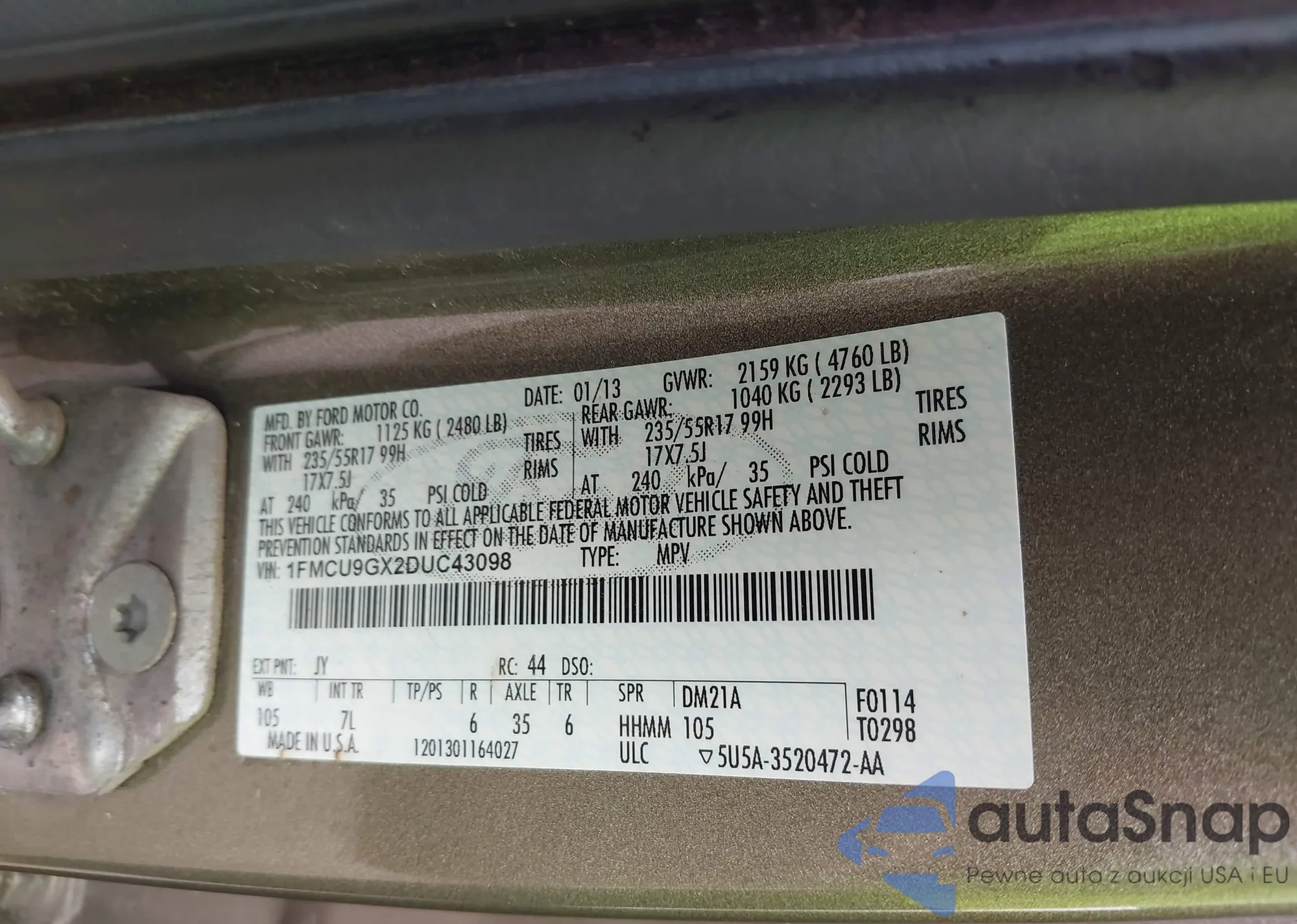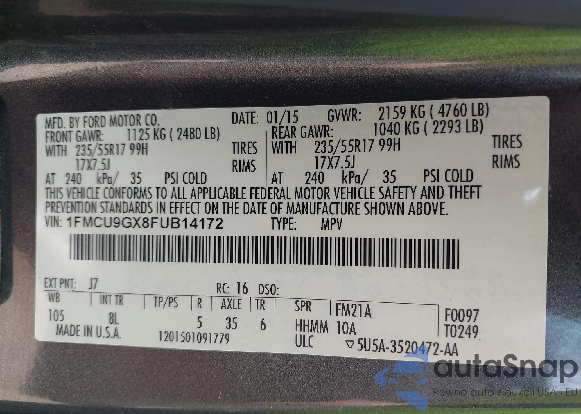 • VIN 1FMCU9GX8FUB14172