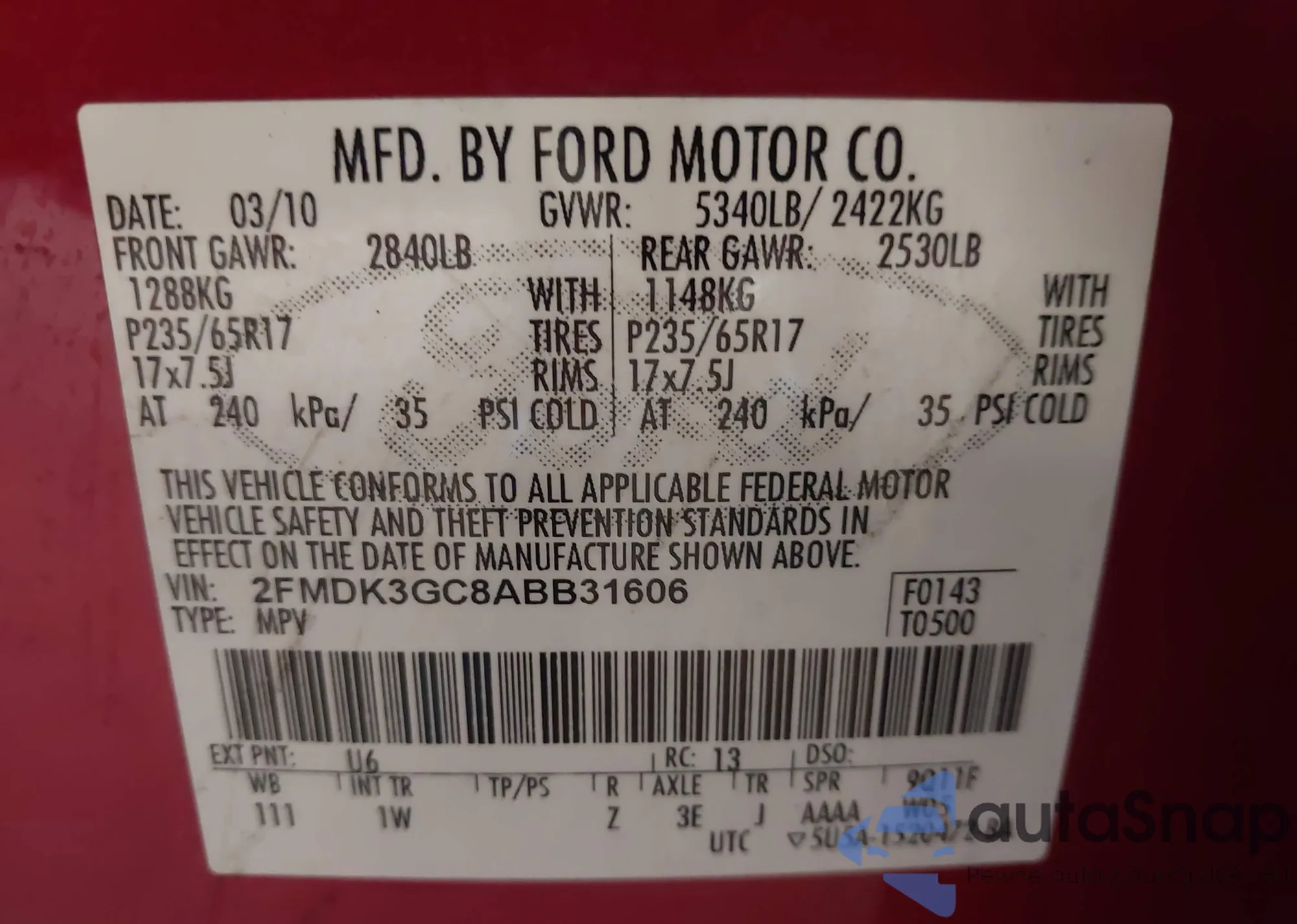• VIN 2FMDK3GC8ABB31606