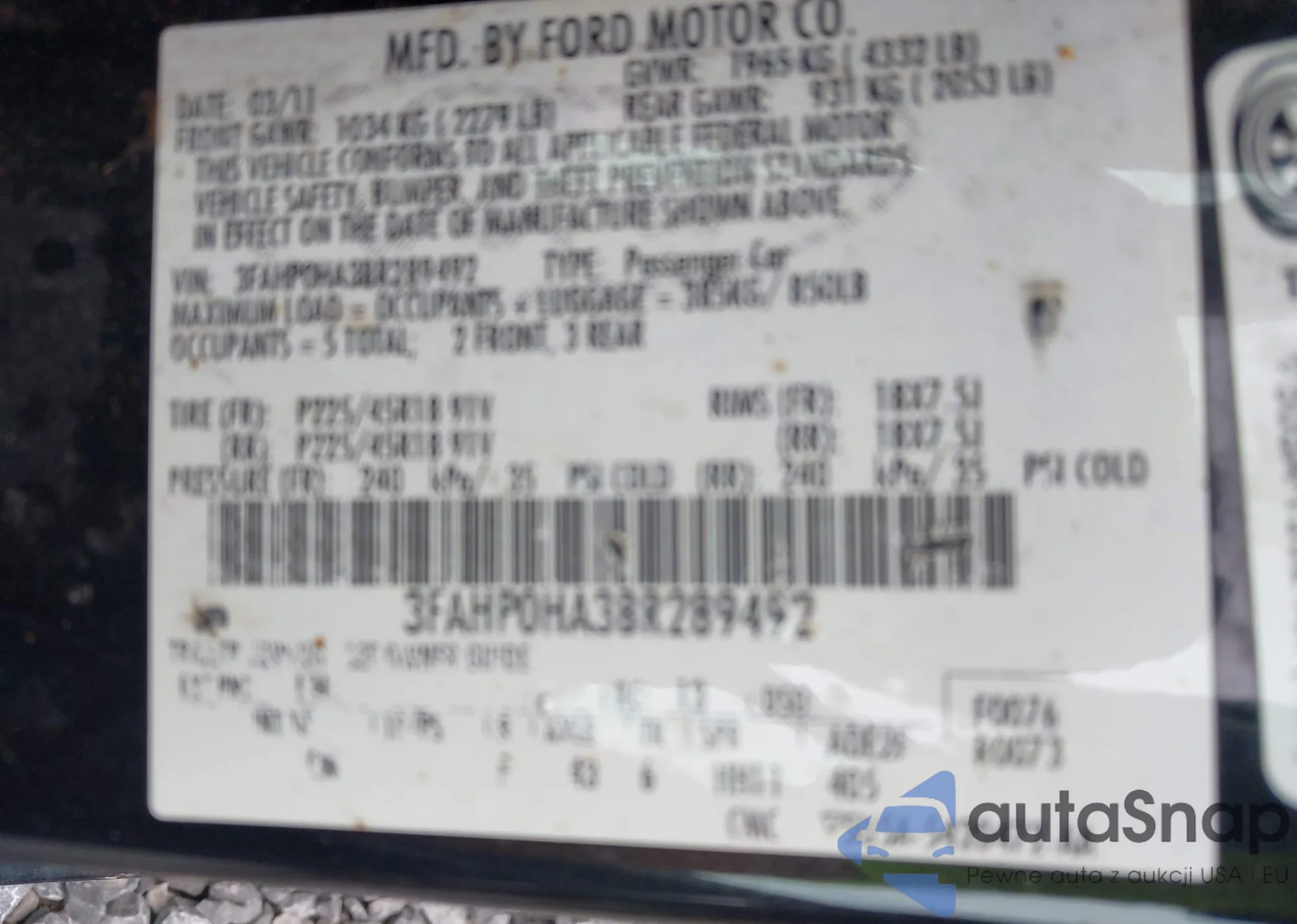 • VIN 3FAHP0HA3BR289492