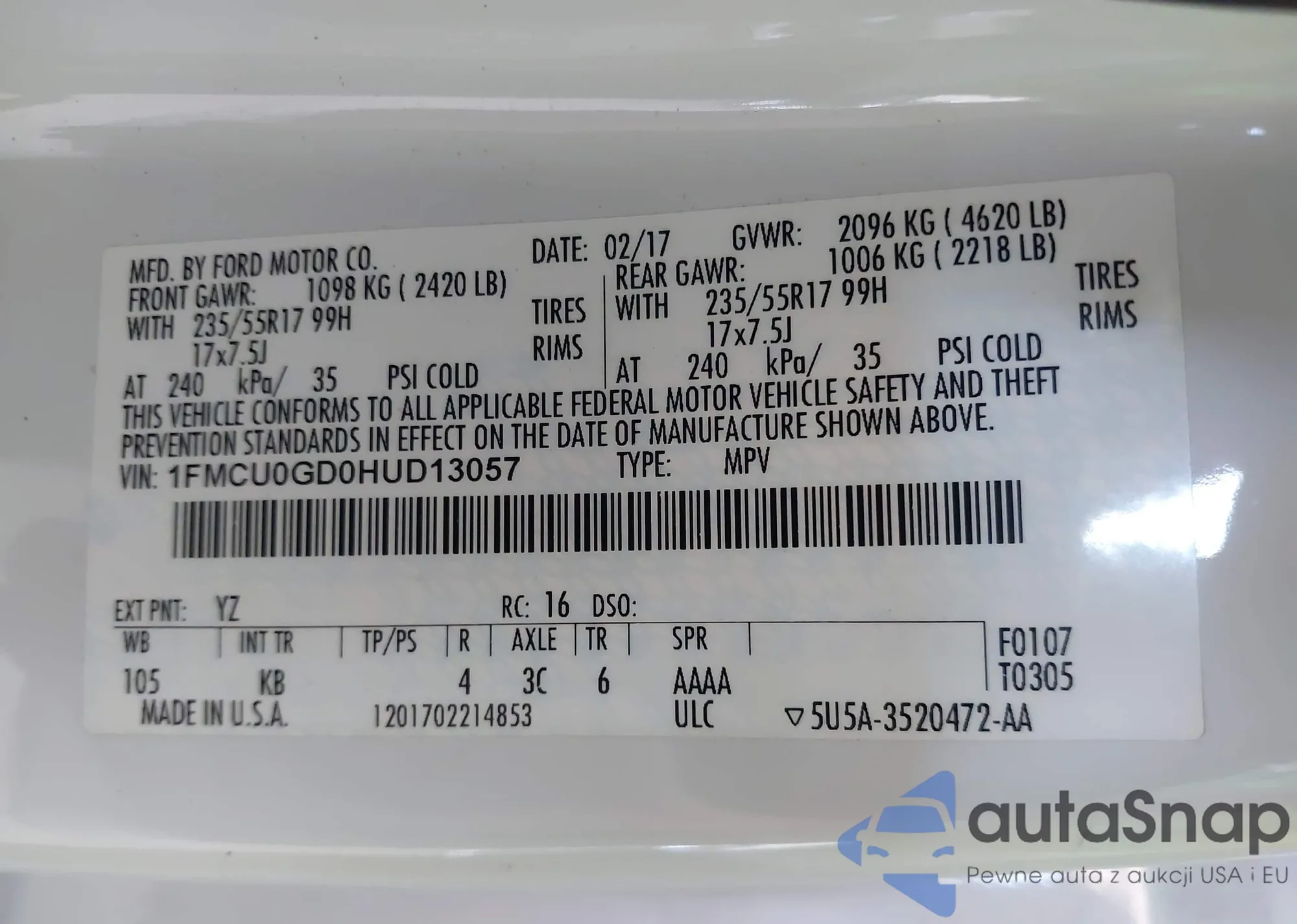 • VIN 1FMCU0GD0HUD13057