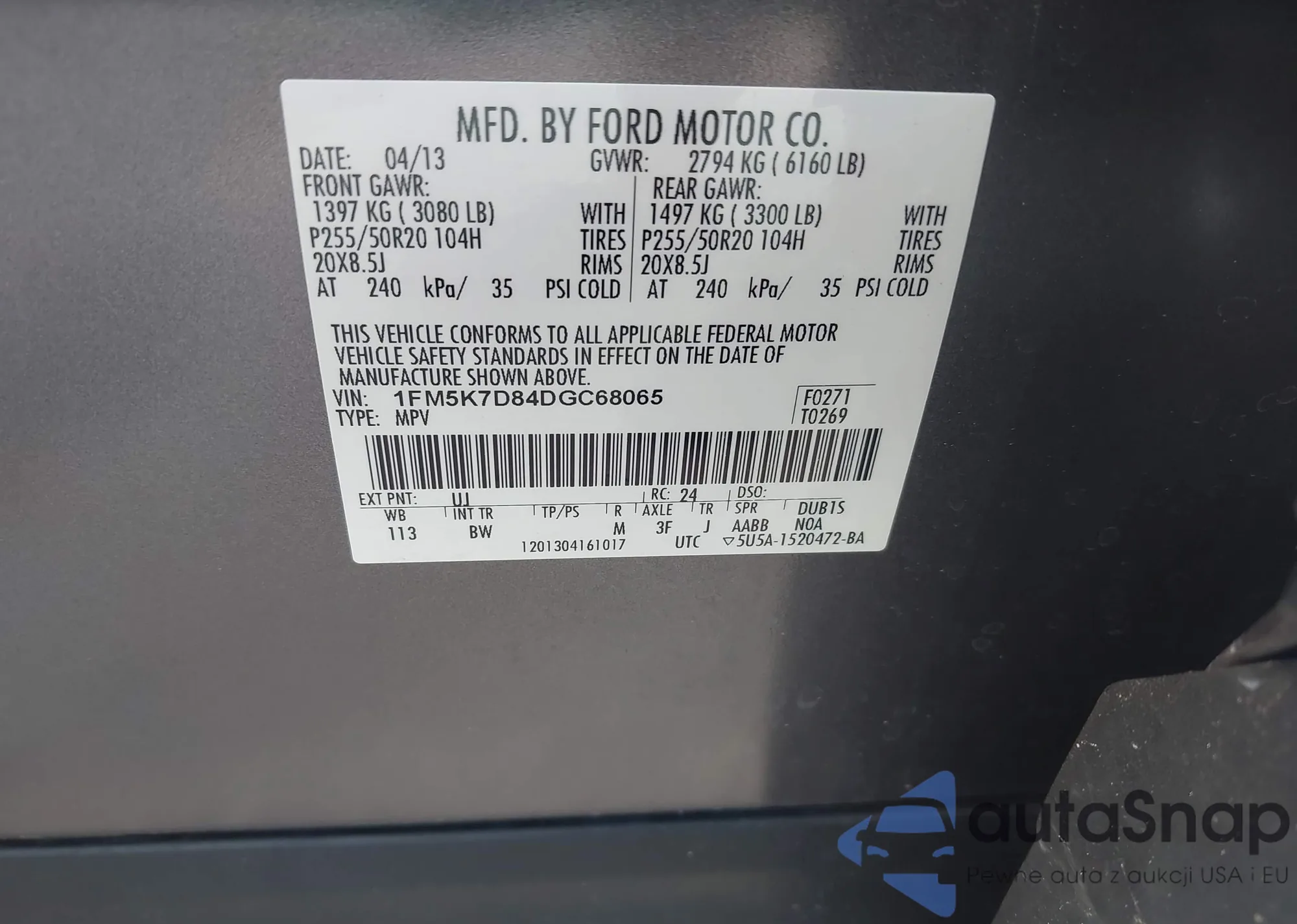 LOT: 42671141 VIN: 1FM5K7D84DGC68065