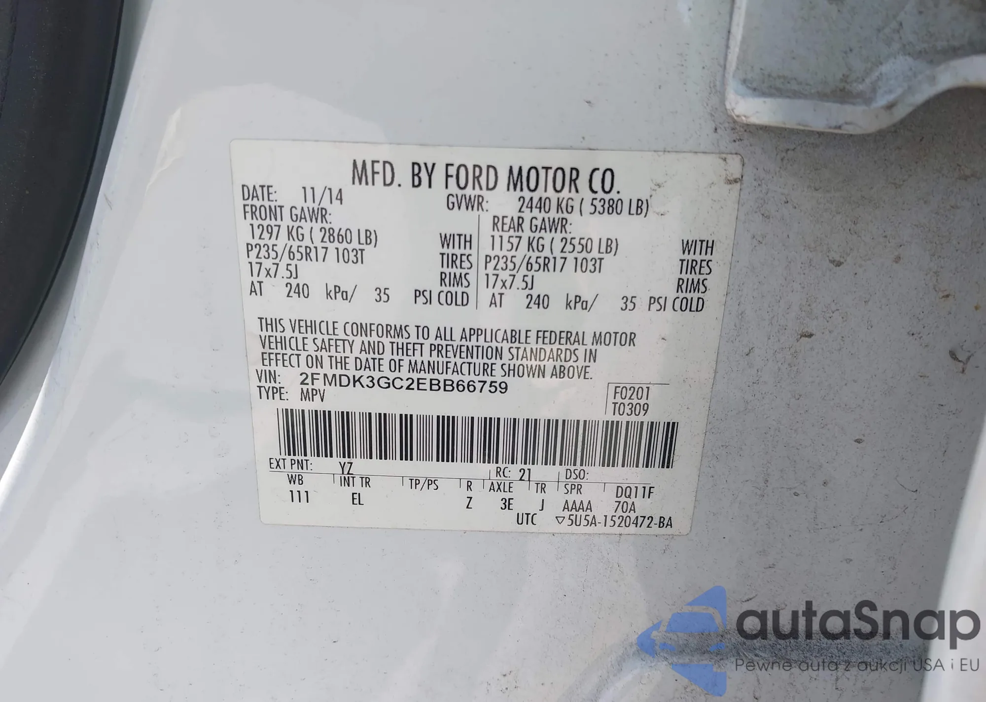 LOT: 42622601 VIN: 2FMPK4G98FBB90220