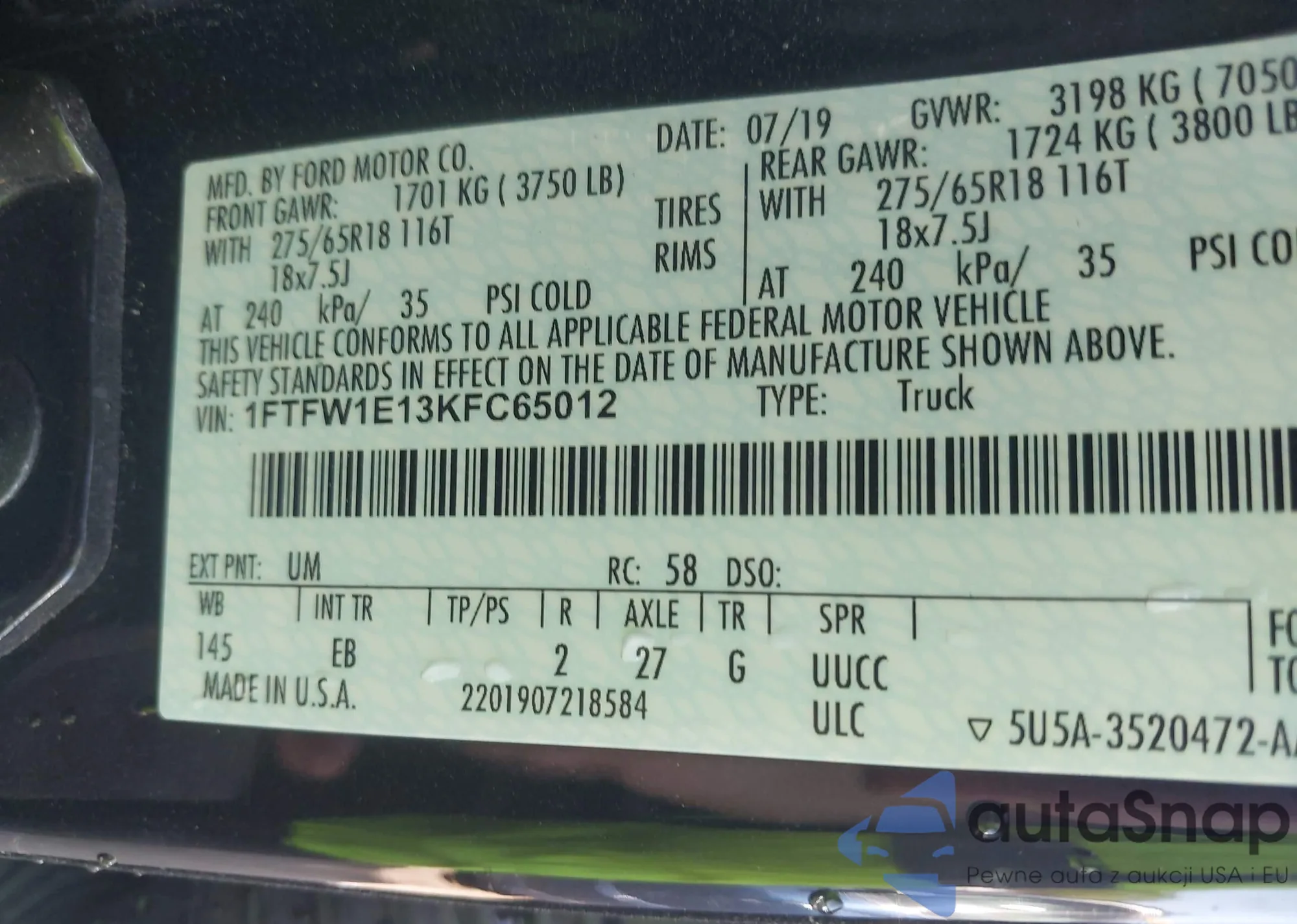 LOT: 42563287 VIN: 1FTFW1E13KFC65012