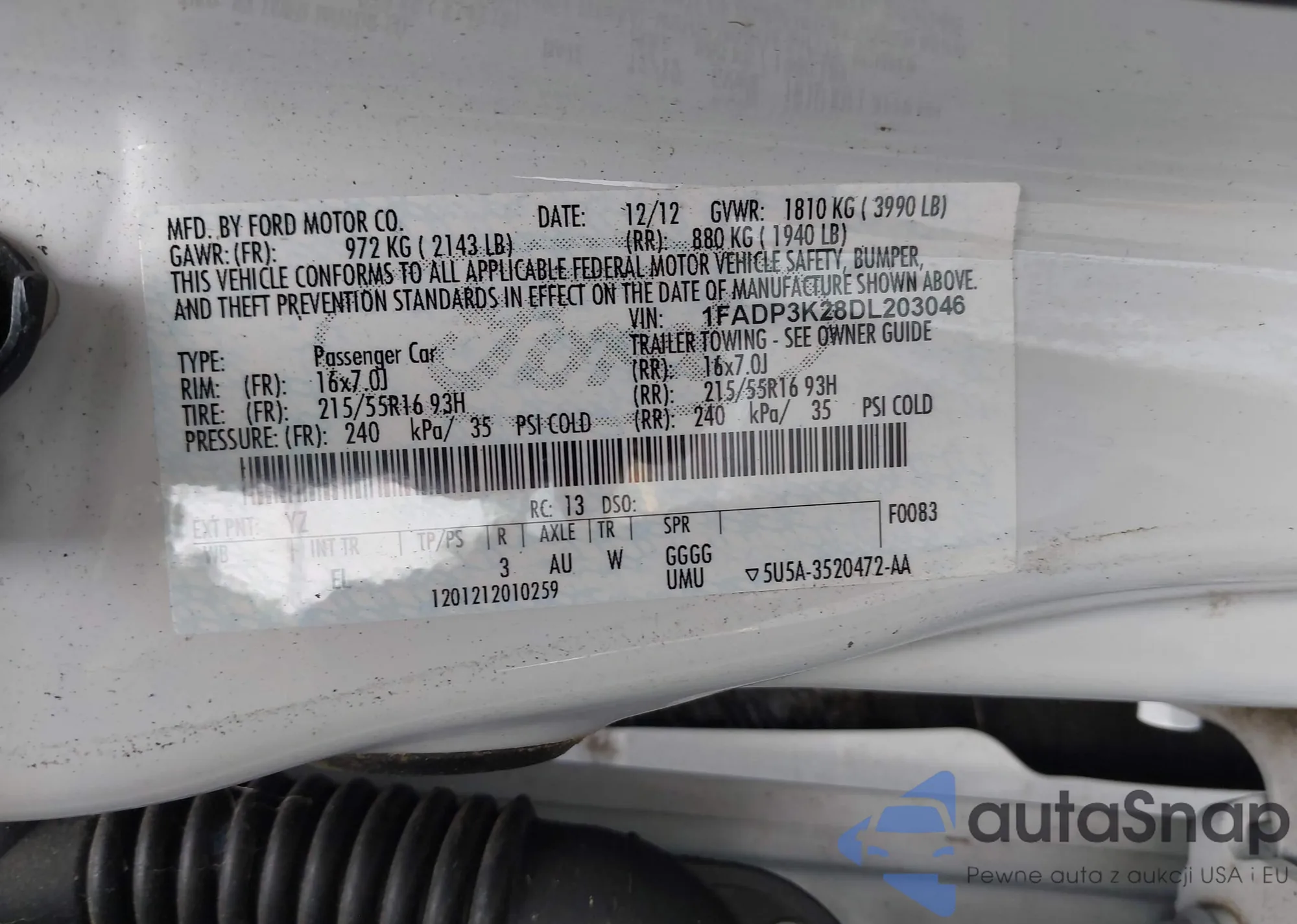 LOT: 42696387 VIN: 1FADP3K28DL203046