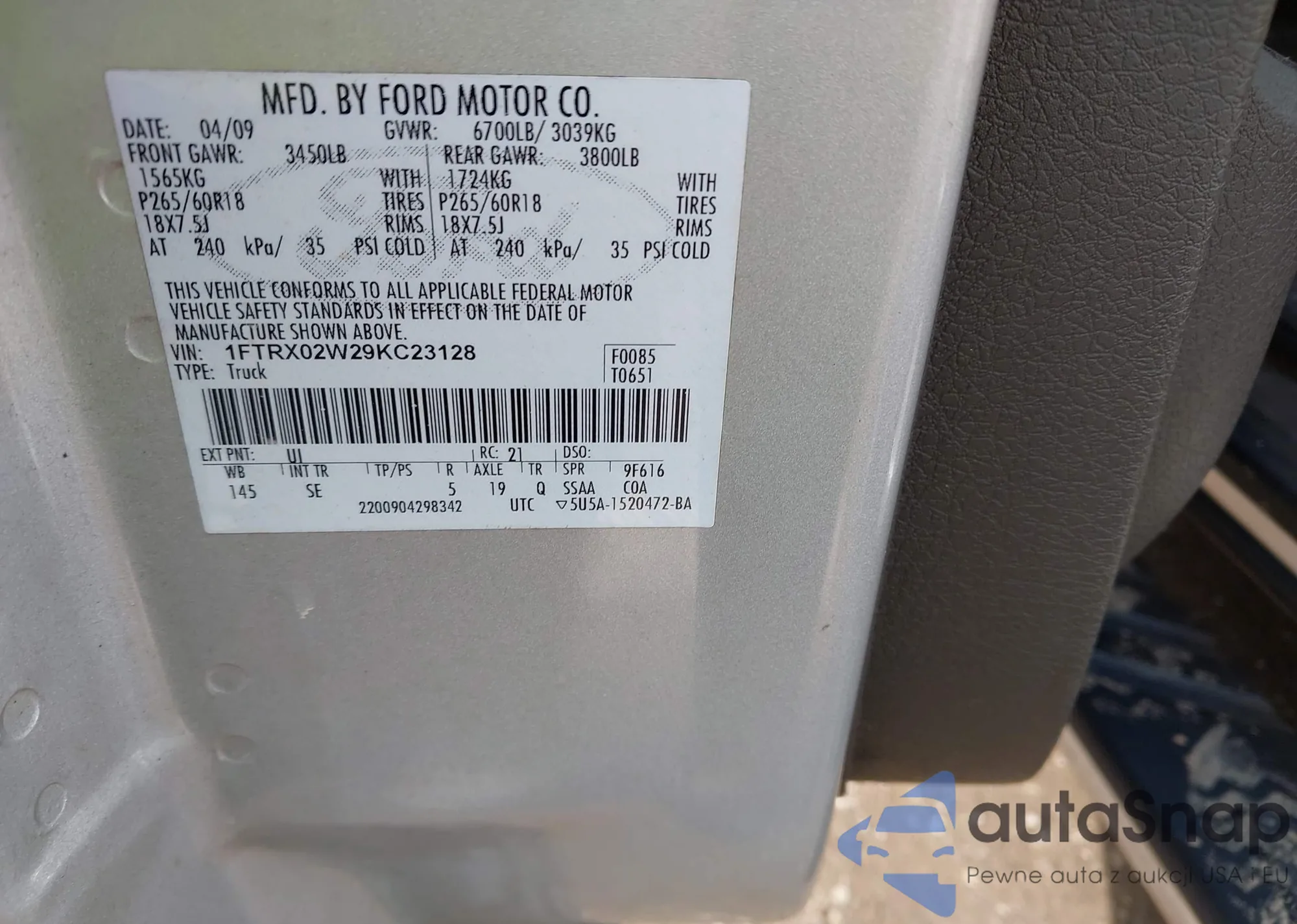 LOT: 42716376 VIN: 1FTRX02W29KC23128