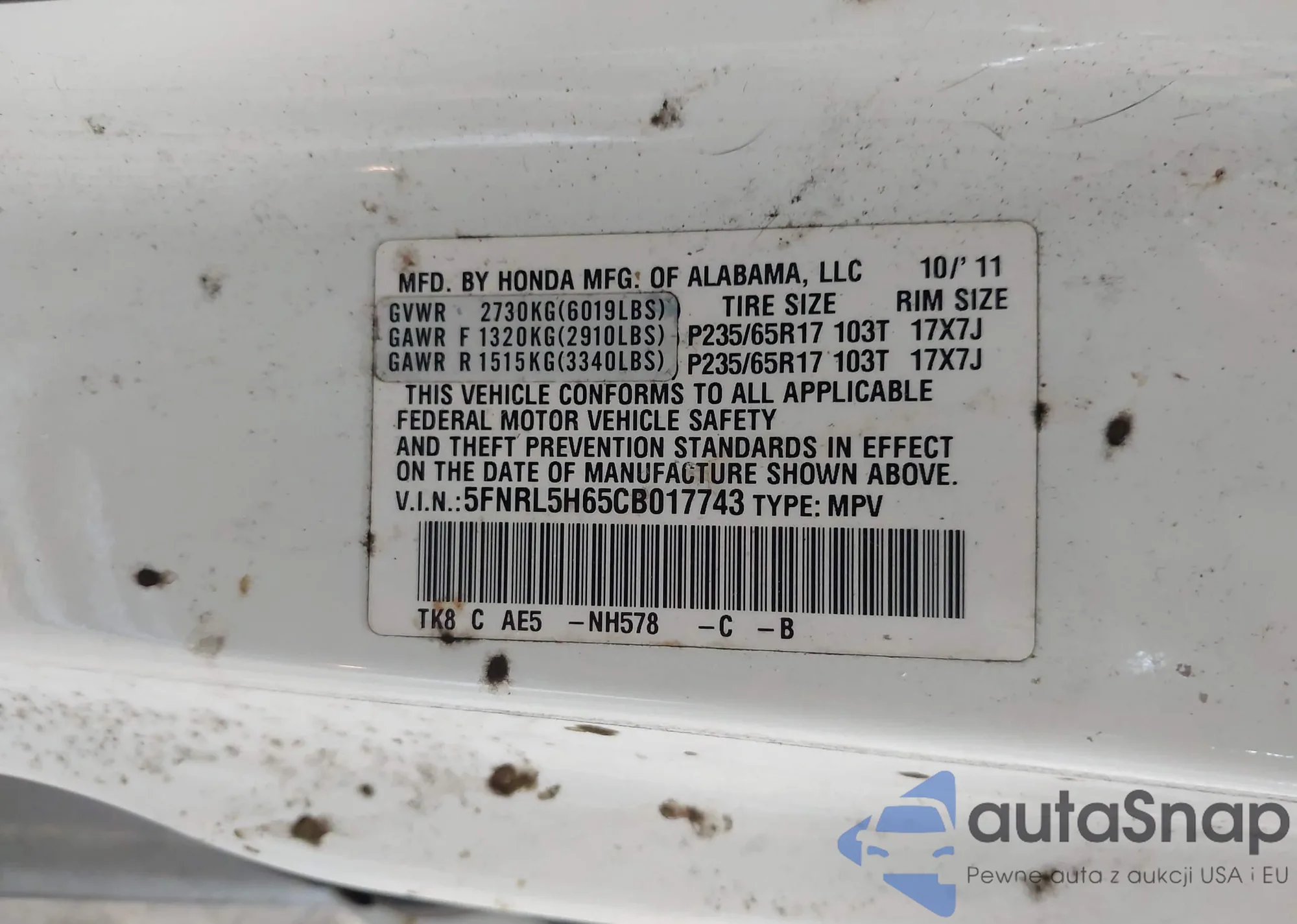 LOT: 42779867 VIN: 5FNRL5H65CB017743