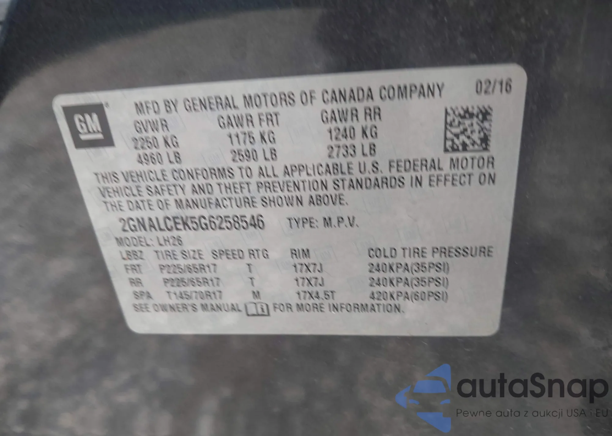 LOT: 42436596 VIN: 2GNALCEK5G6258546
