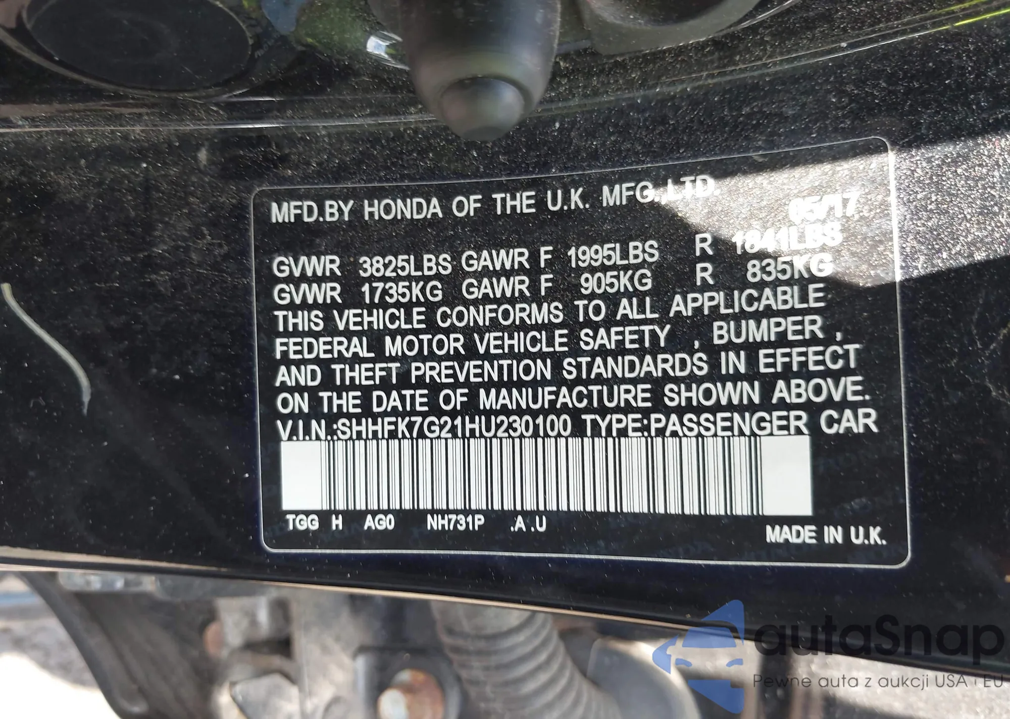 • VIN SHHFK7G21HU230100