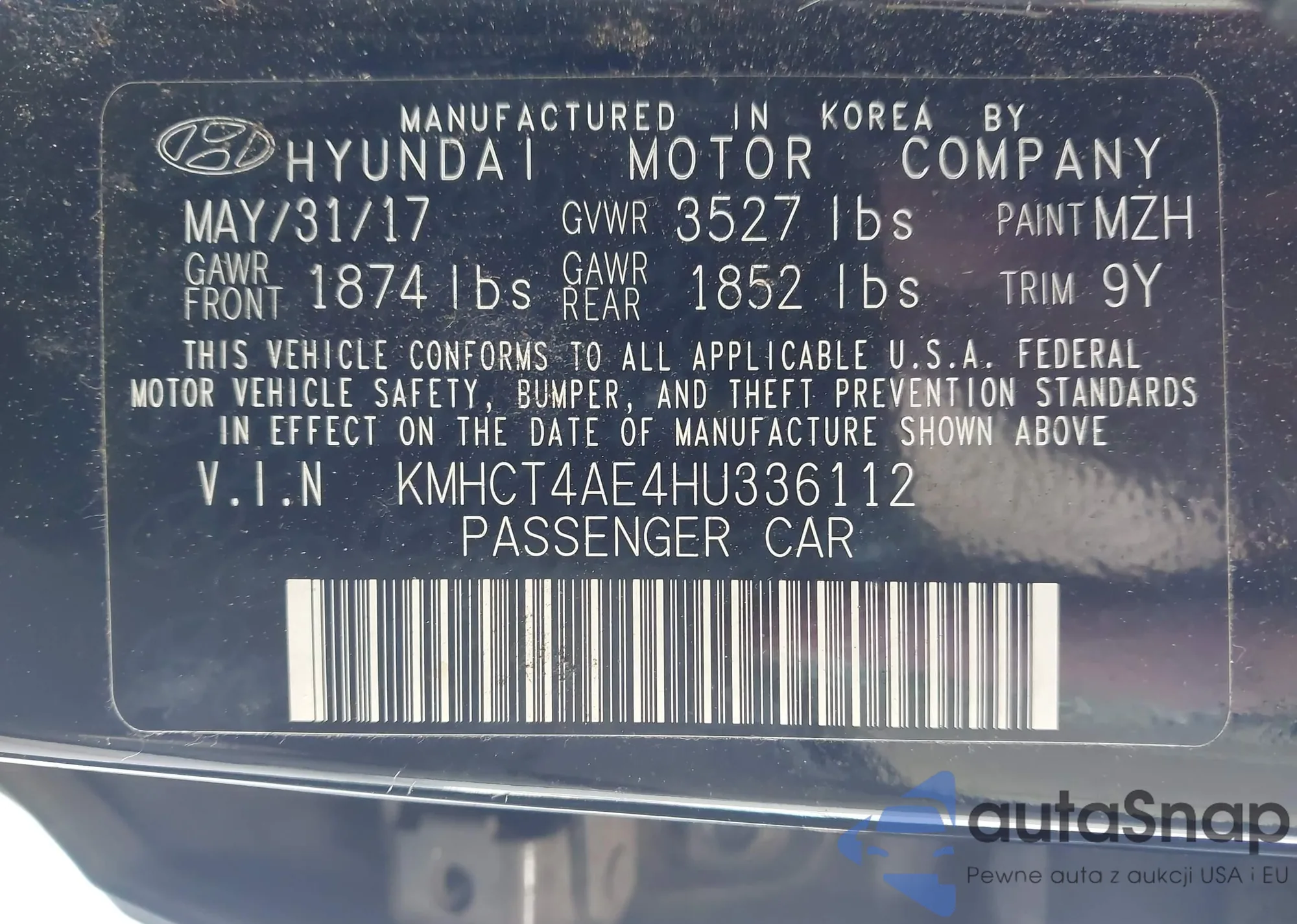 LOT: 42751804 VIN: KMHCT4AE4HU336112
