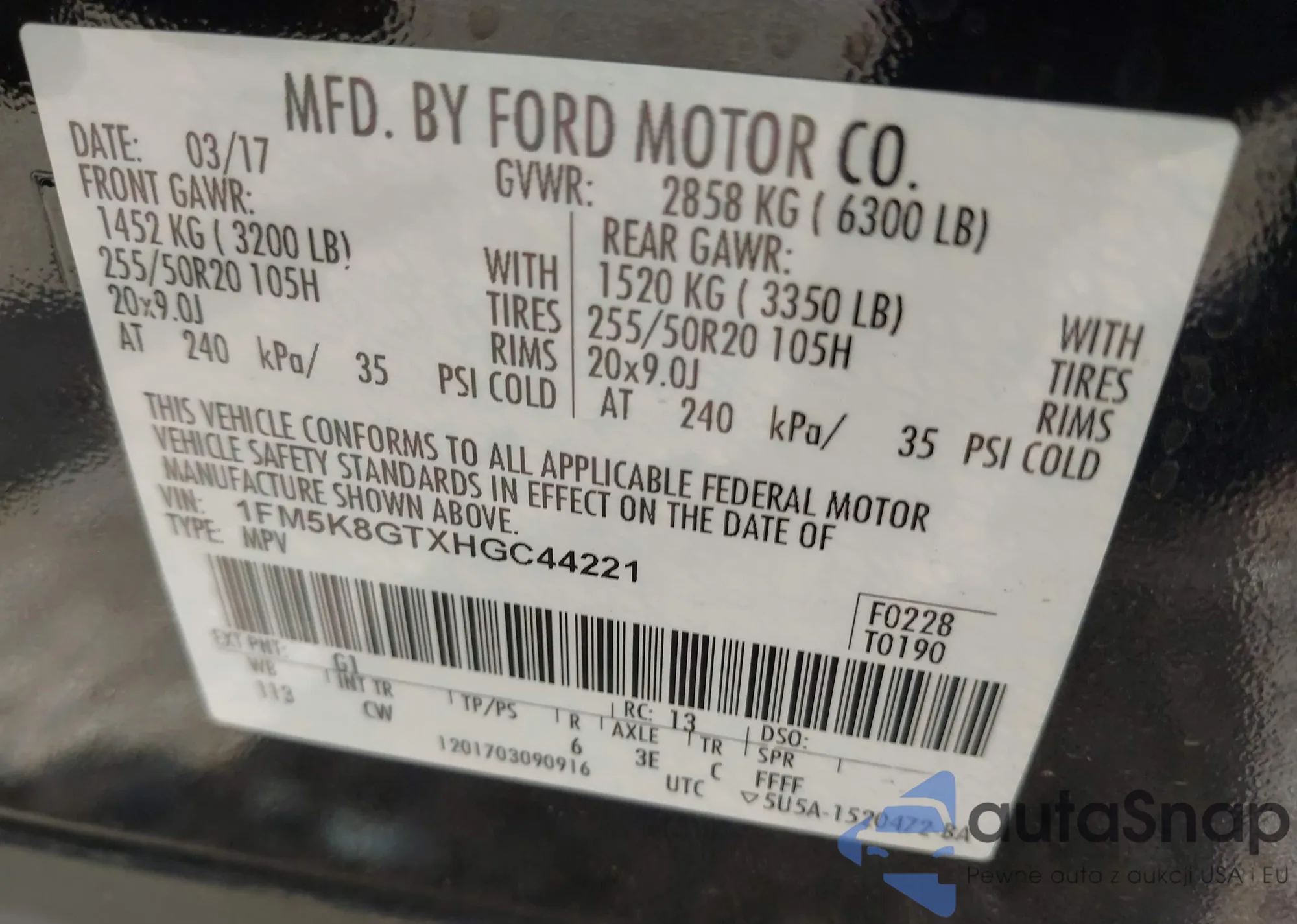 LOT: 42320720 VIN: 1FM5K8GTXHGC44221
