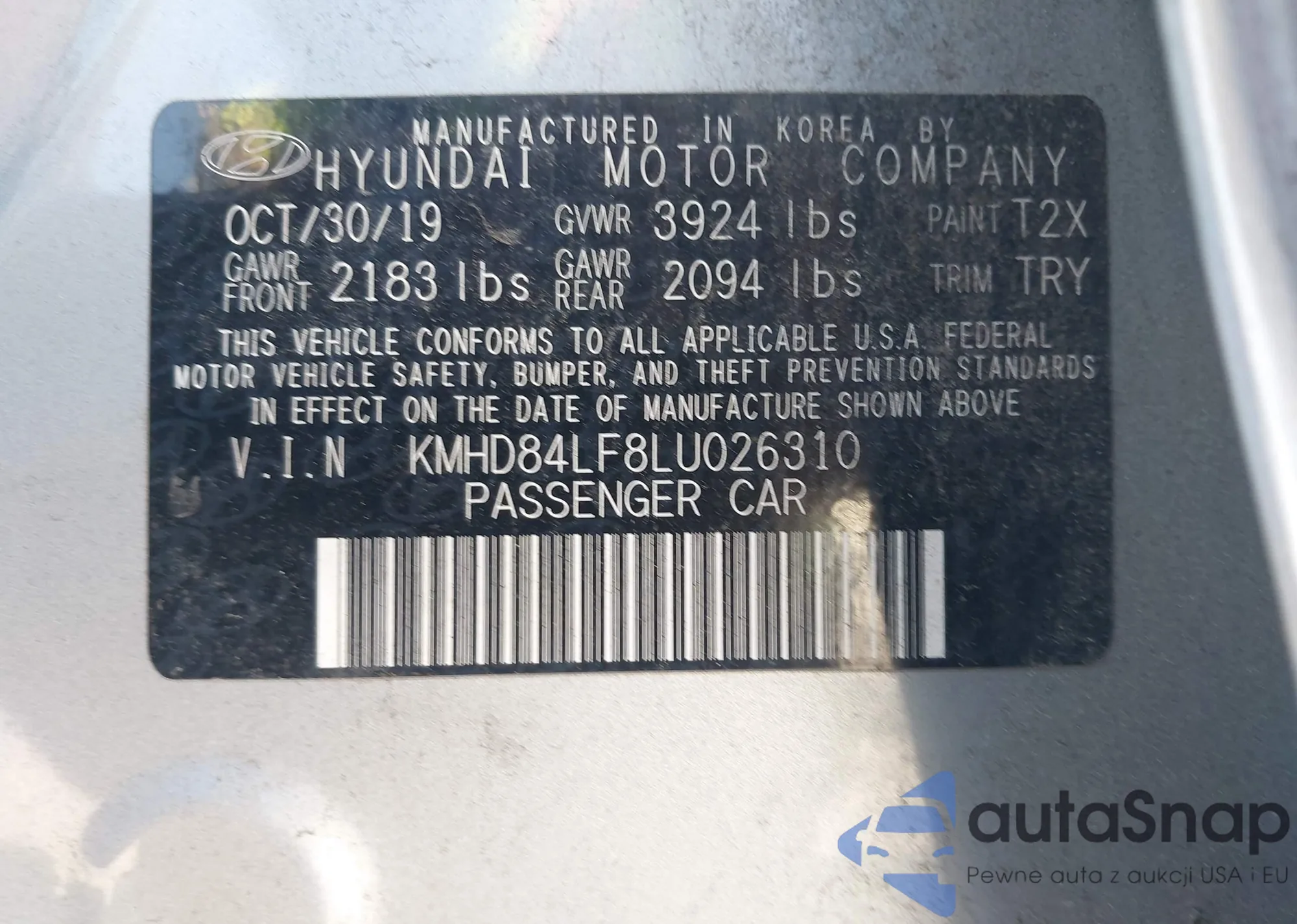 LOT: 42441406 VIN: KMHD84LF8LU026310
