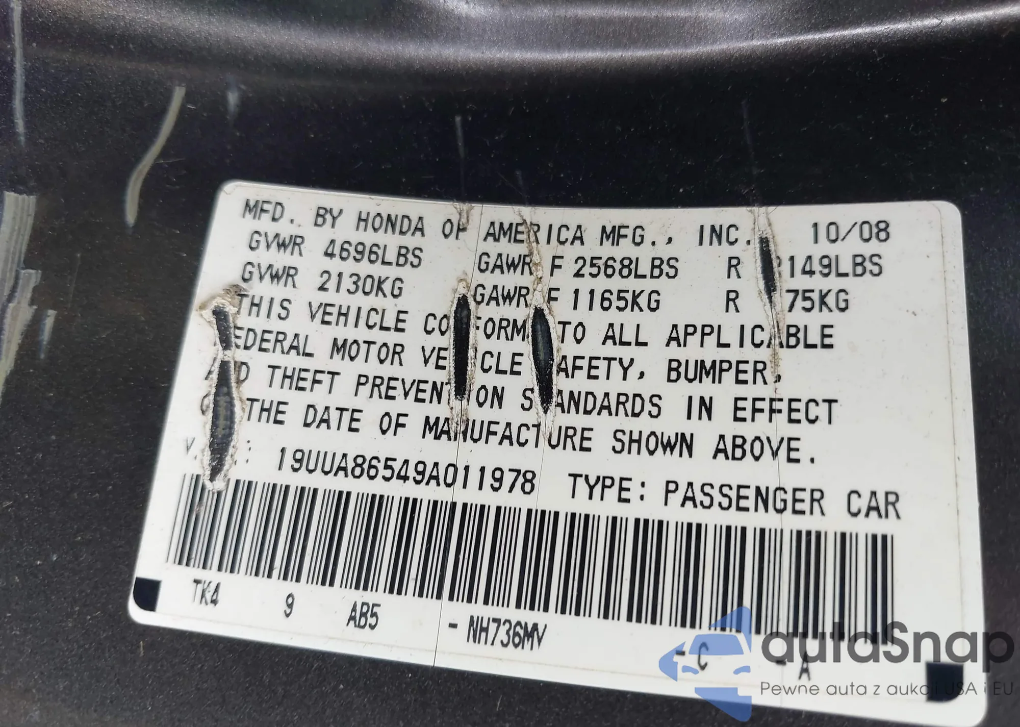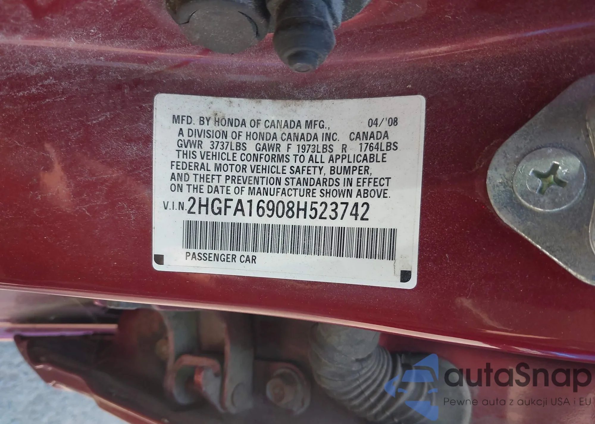 LOT: 42823180 VIN: 2HGFA16908H523742