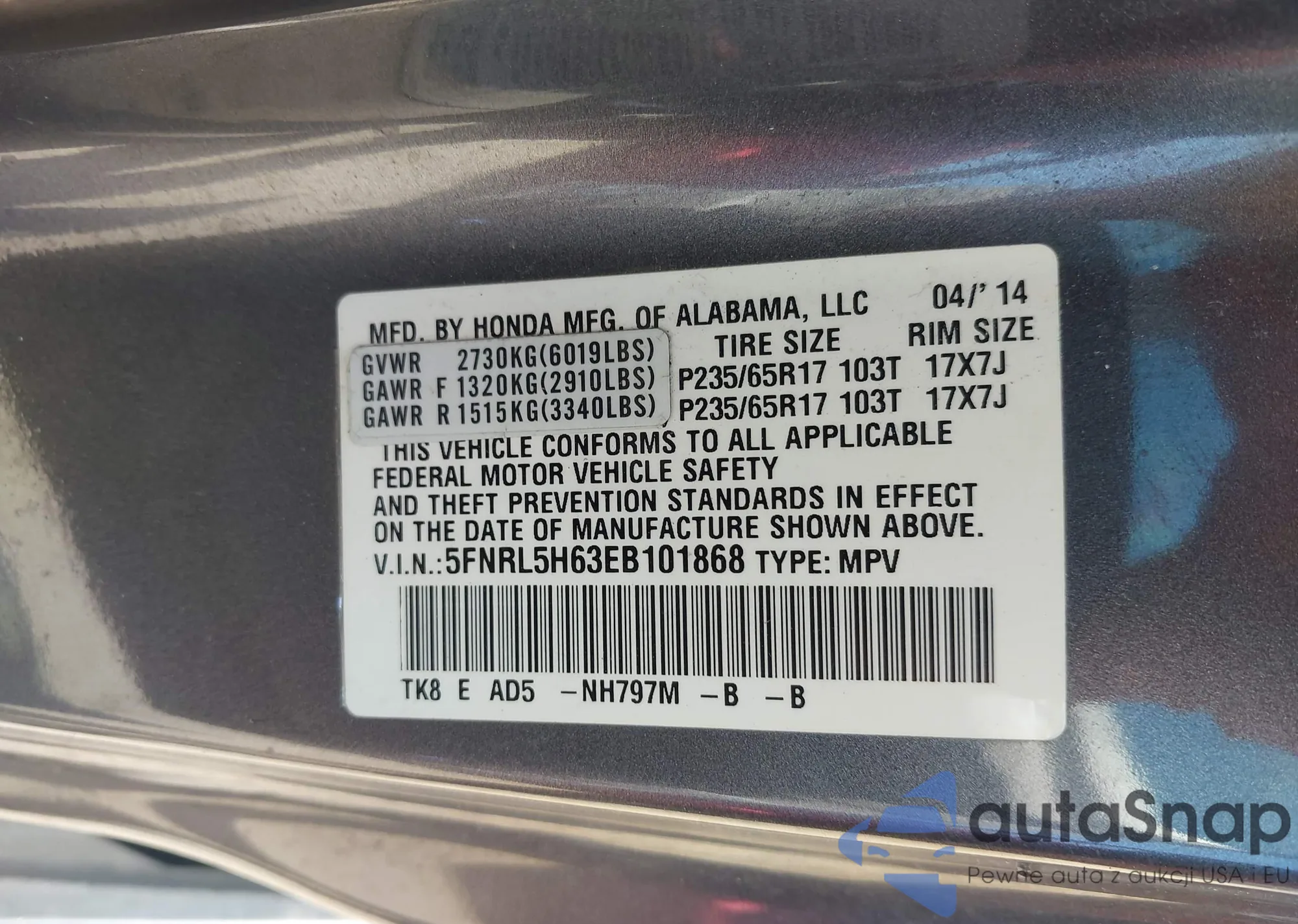 • VIN 5FNRL5H63EB101868