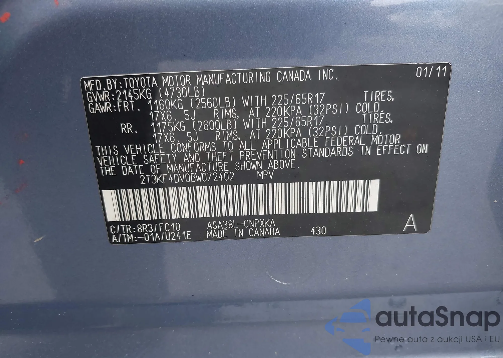 LOT: 42613112 VIN: 2T3KF4DV0BW072402