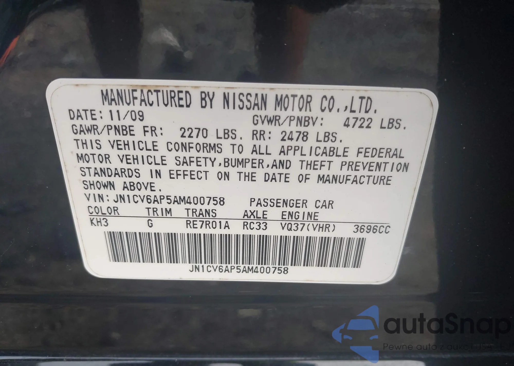 LOT: 42453875 VIN: JN1CV6AP5AM400758