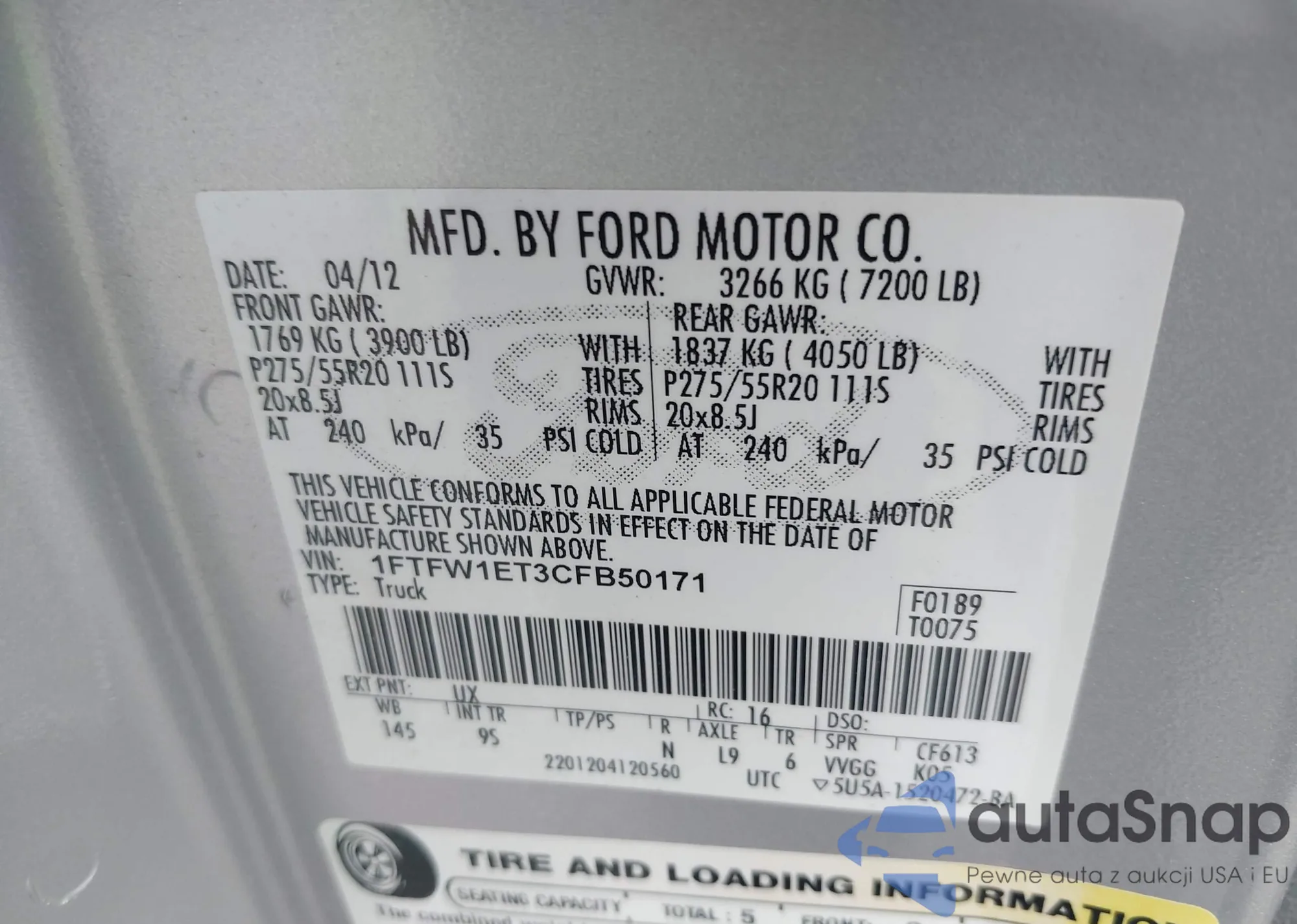 • VIN 1FTFW1ET3CFB50171