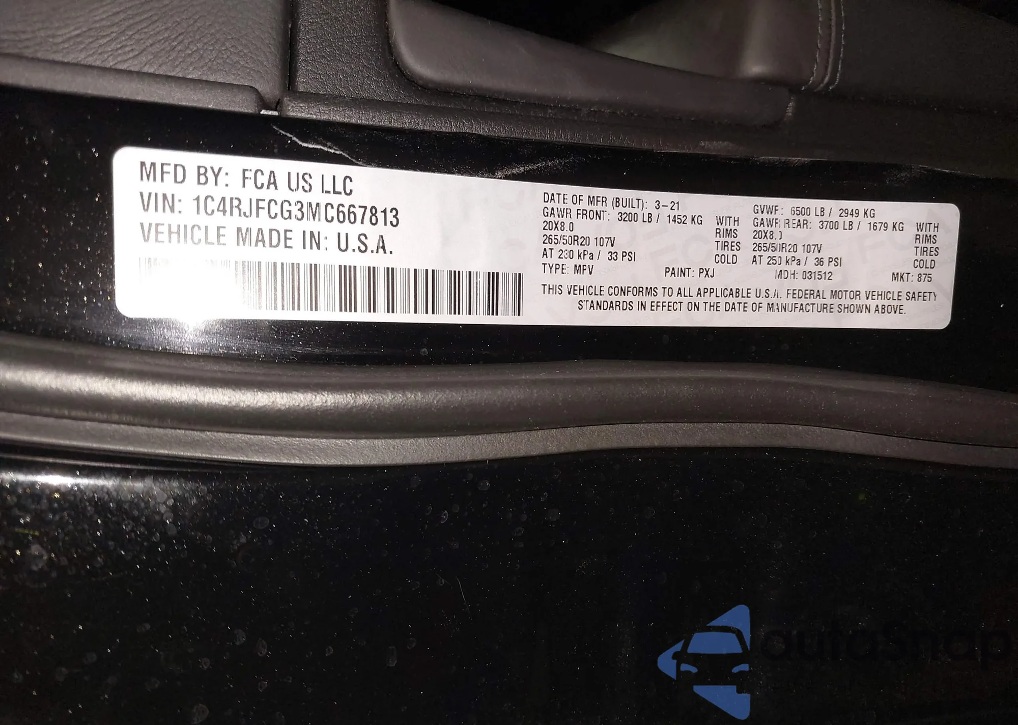 • VIN 1C4RJFCG3MC667813