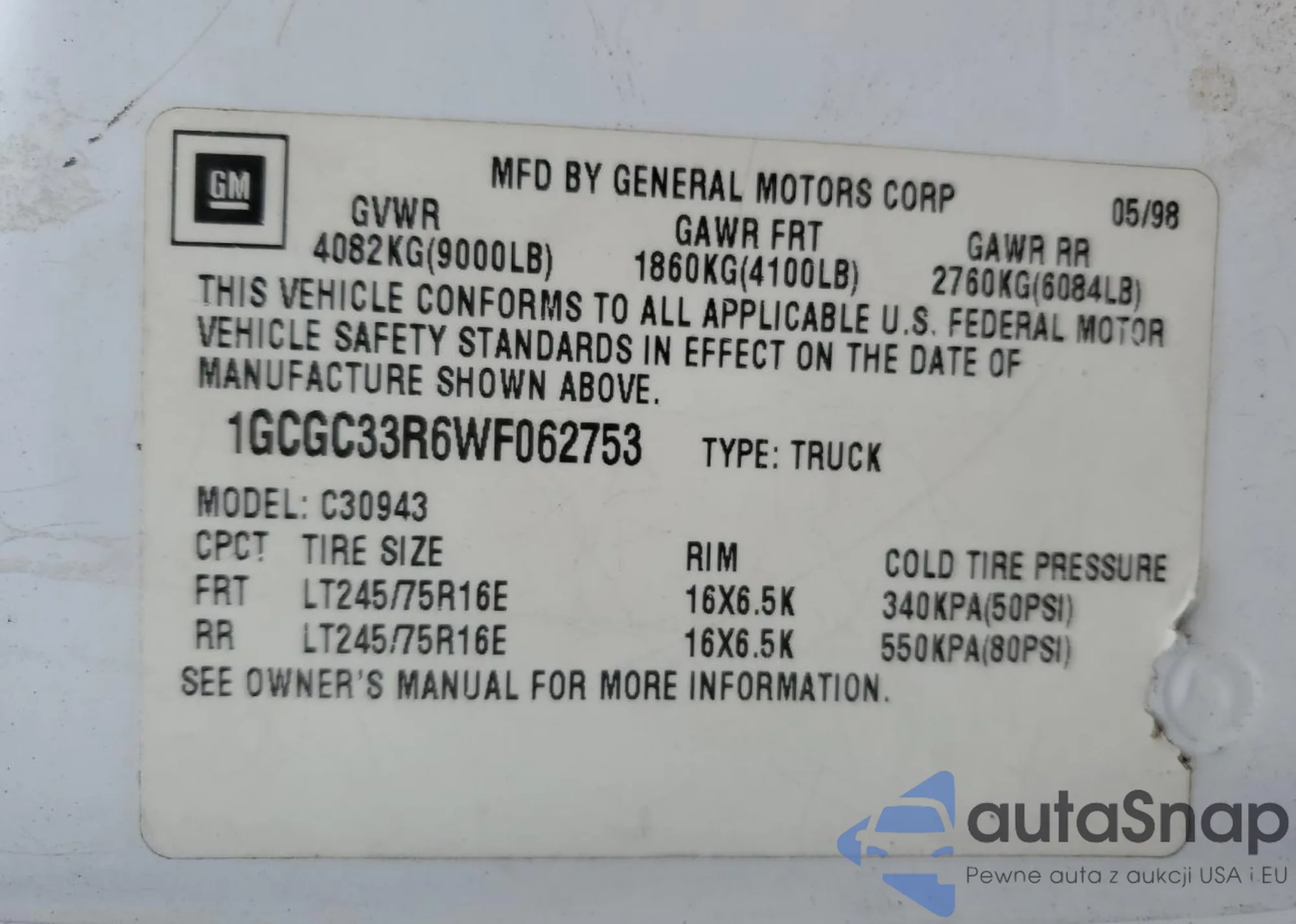 LOT: 87868205 VIN: 1GCGC33R6WF062753