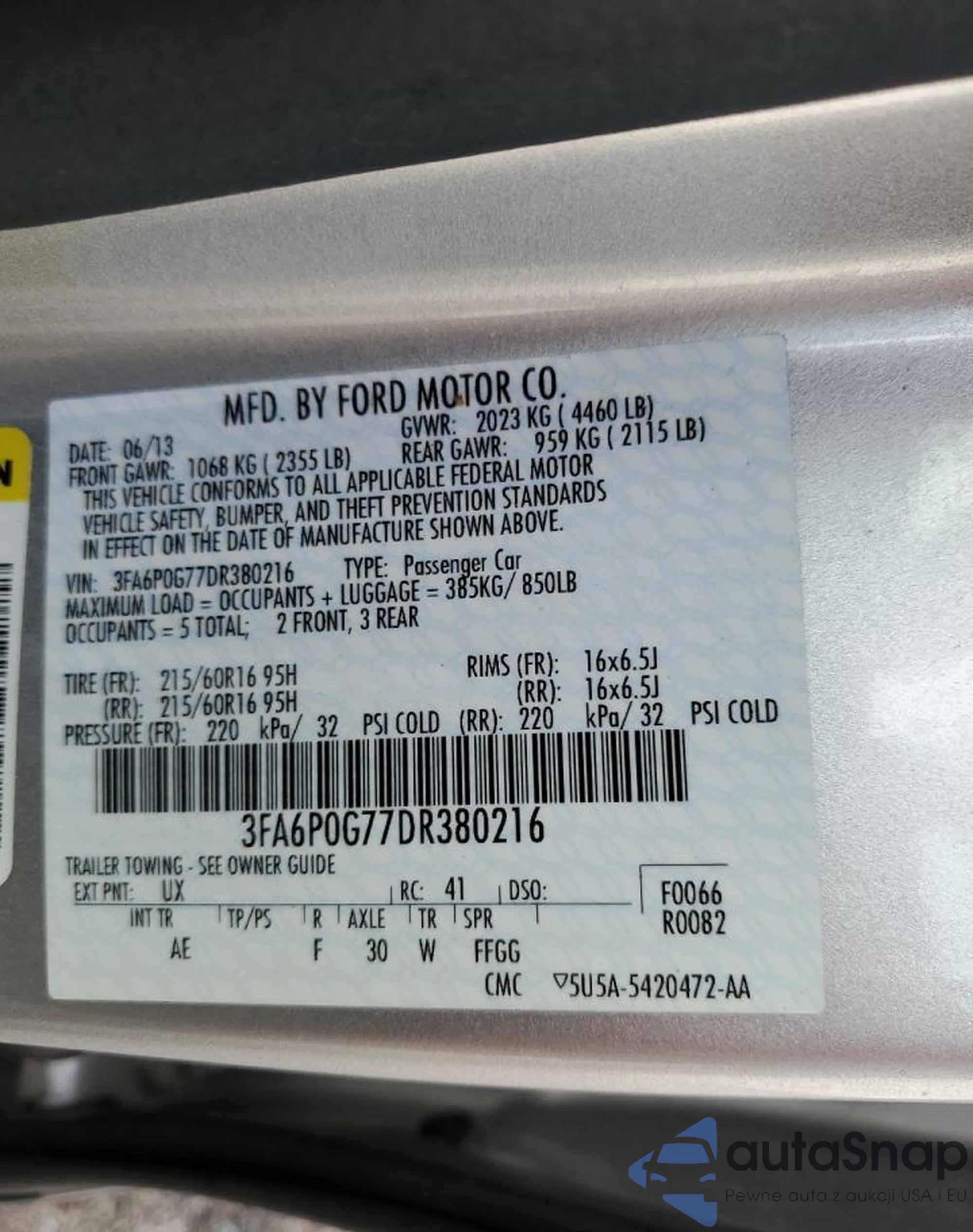 LOT: 58502285 VIN: 3FA6P0G77DR380216