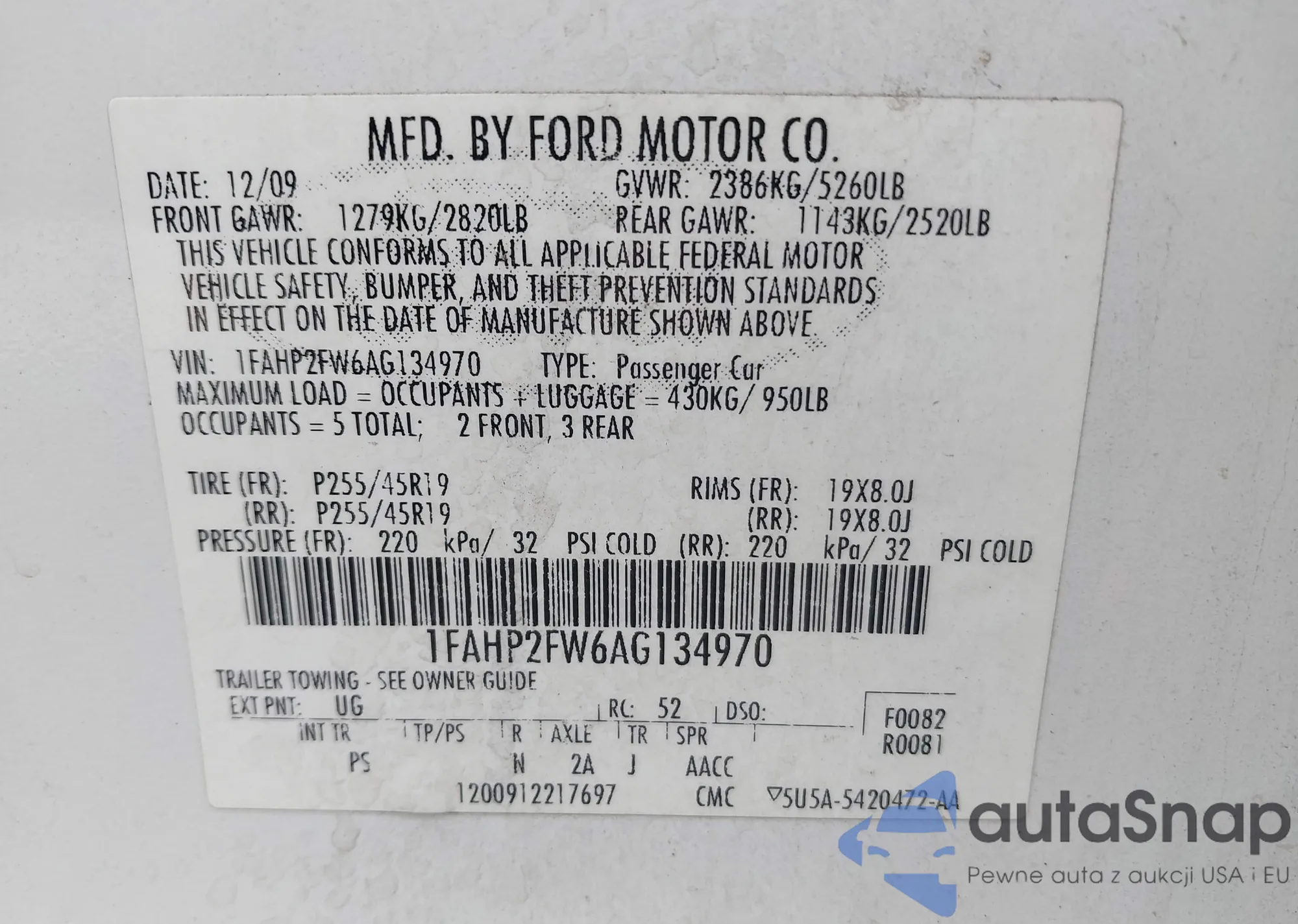 LOT: 42521161 VIN: 1FAHP2FW6AG134970