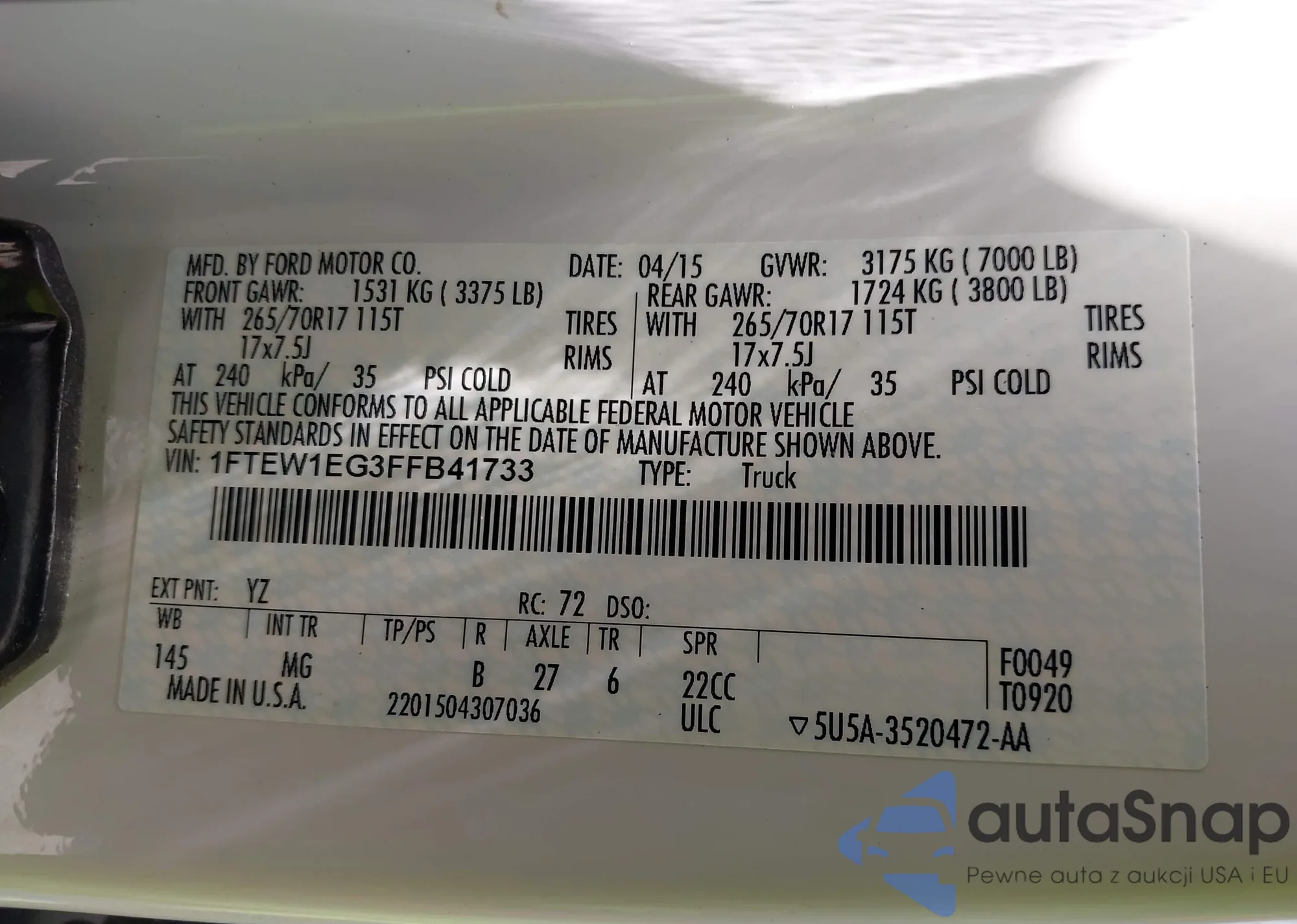 LOT: 42712200 VIN: 1FTEW1EG3FFB41733