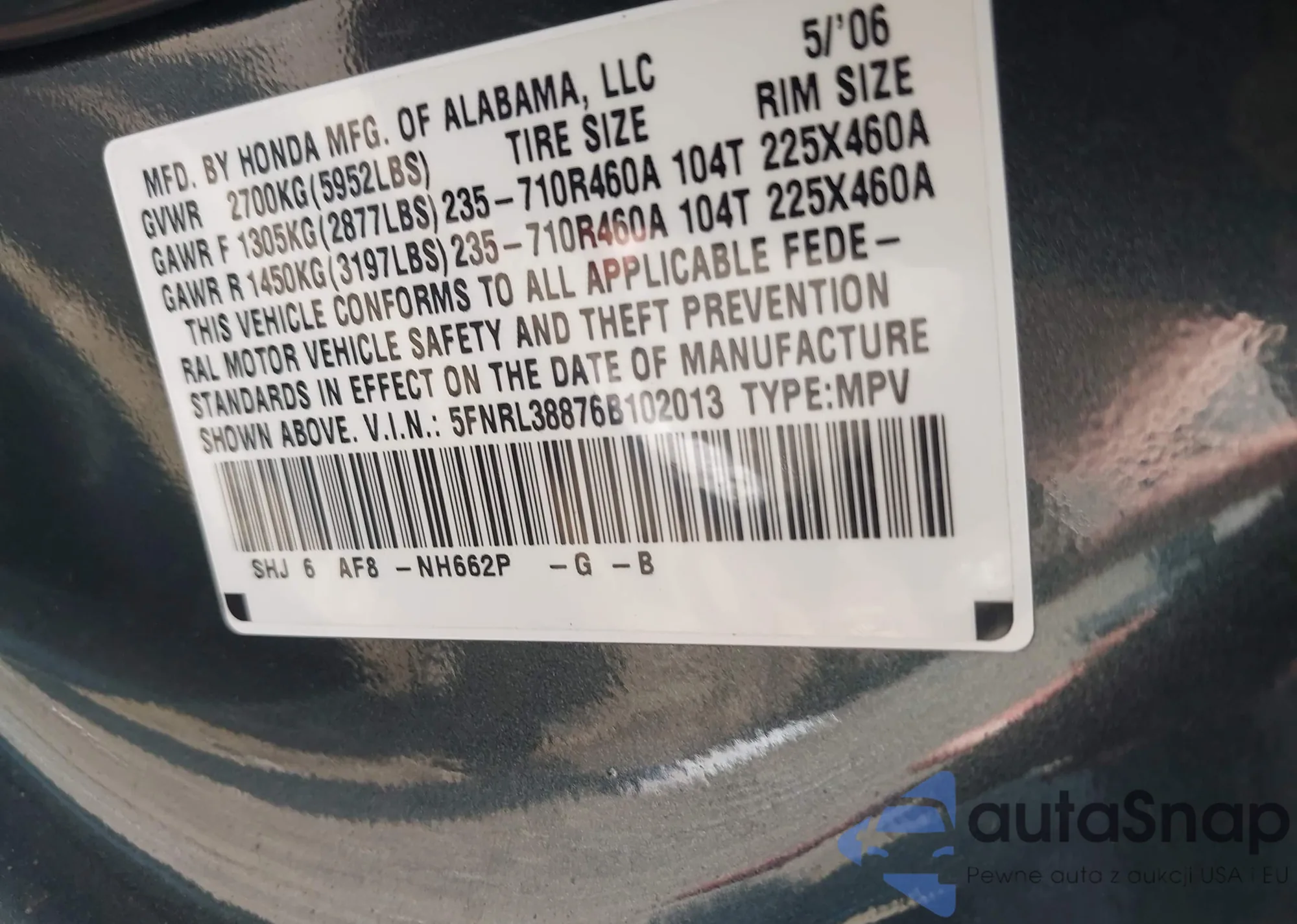 • VIN 5FNRL38876B102013