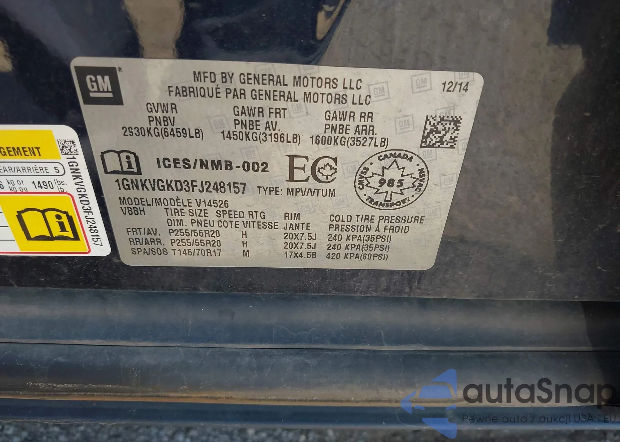 LOT: 42793533 VIN: 1GNKVGKD3FJ248157