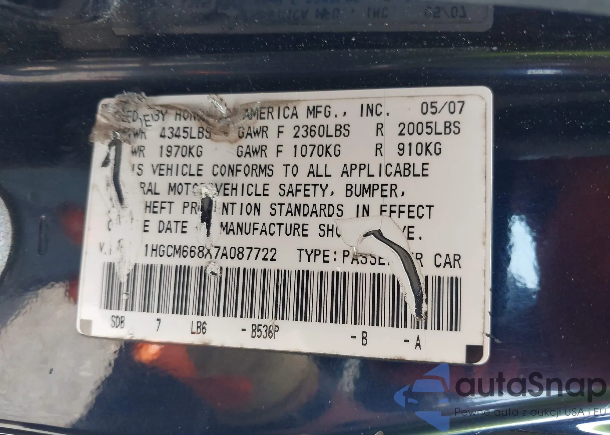 2007 Honda Accord 3.0 Ex z USA, uszkodzony, nr VIN 1HGCM668X7A087722