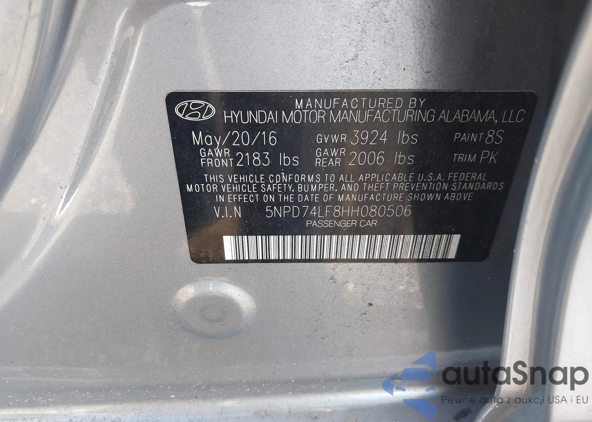 LOT: 42715299 VIN: 5NPD74LF8HH080506