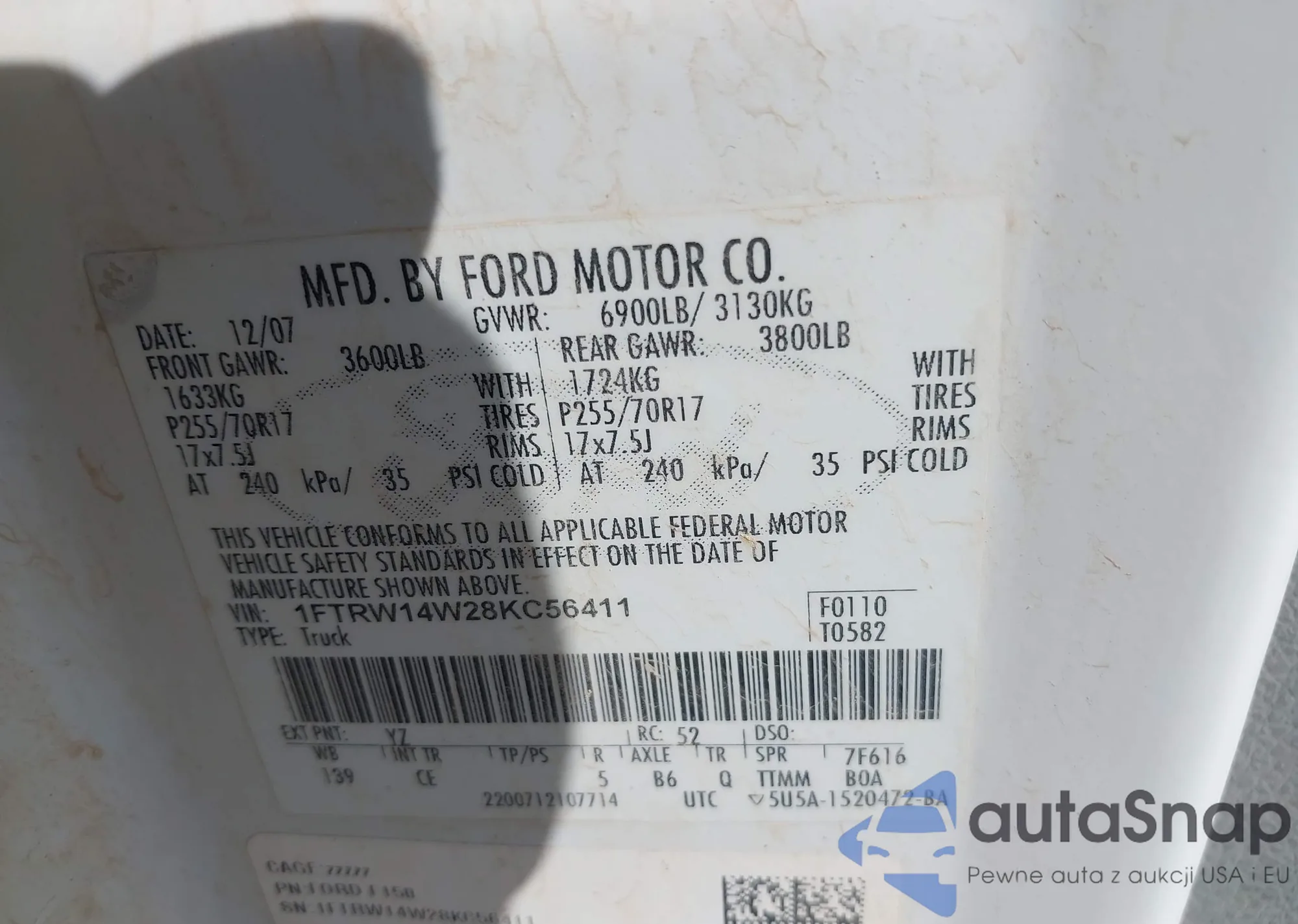LOT: 42484767 VIN: 1FTRW14W28KC56411