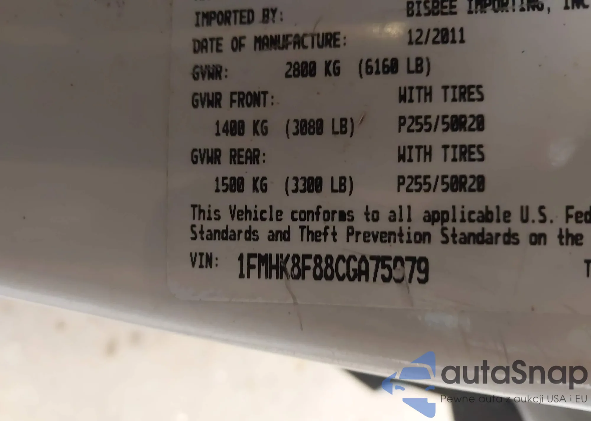 LOT: 42515941 VIN: 1FMHK8F88CGA75979