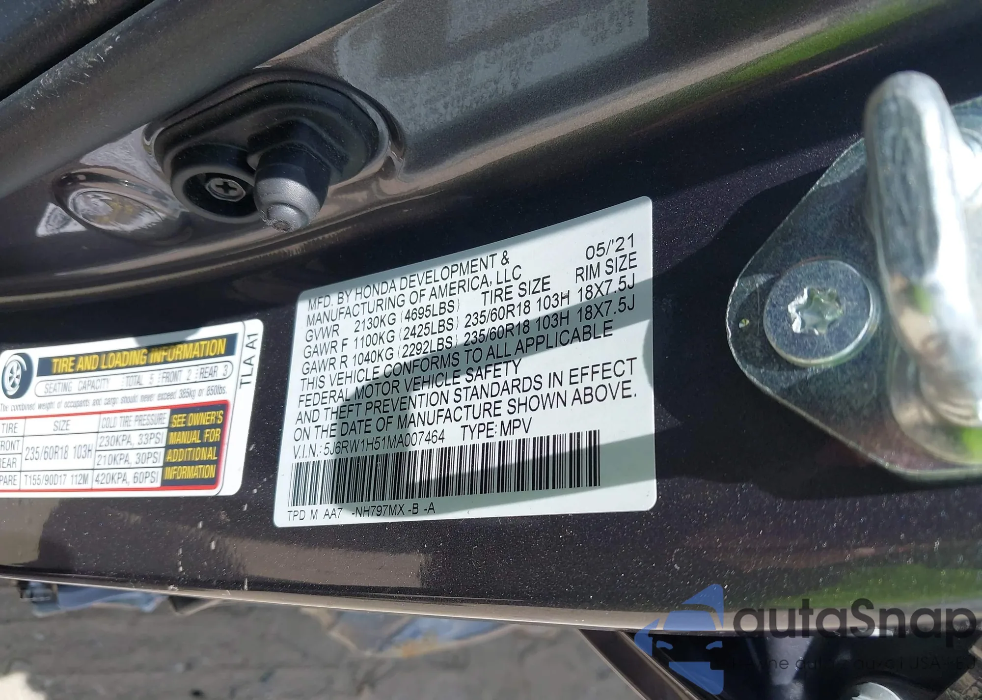 • VIN 5J6RW1H51MA007464