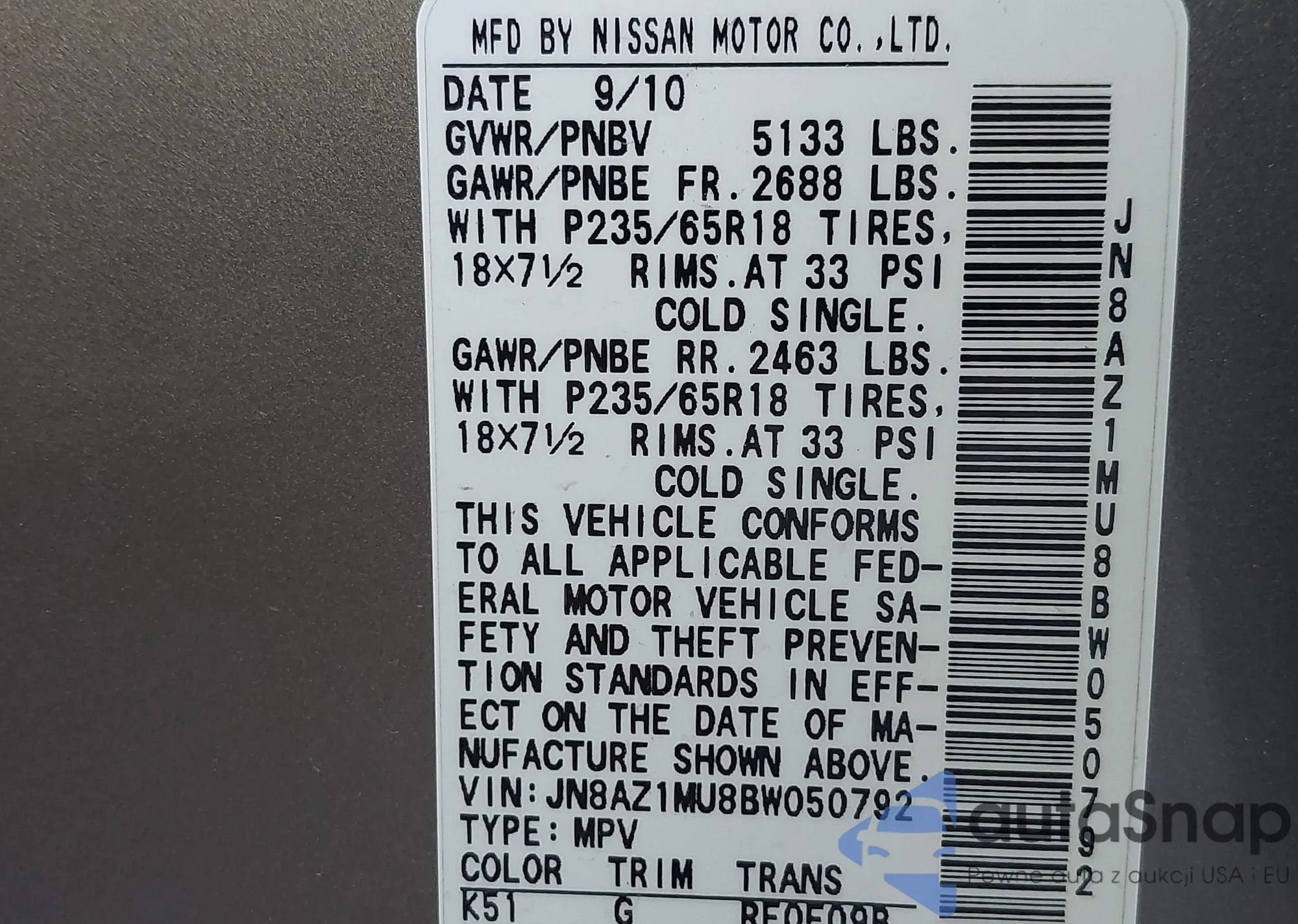 • VIN JN8AZ1MU8BW050792
