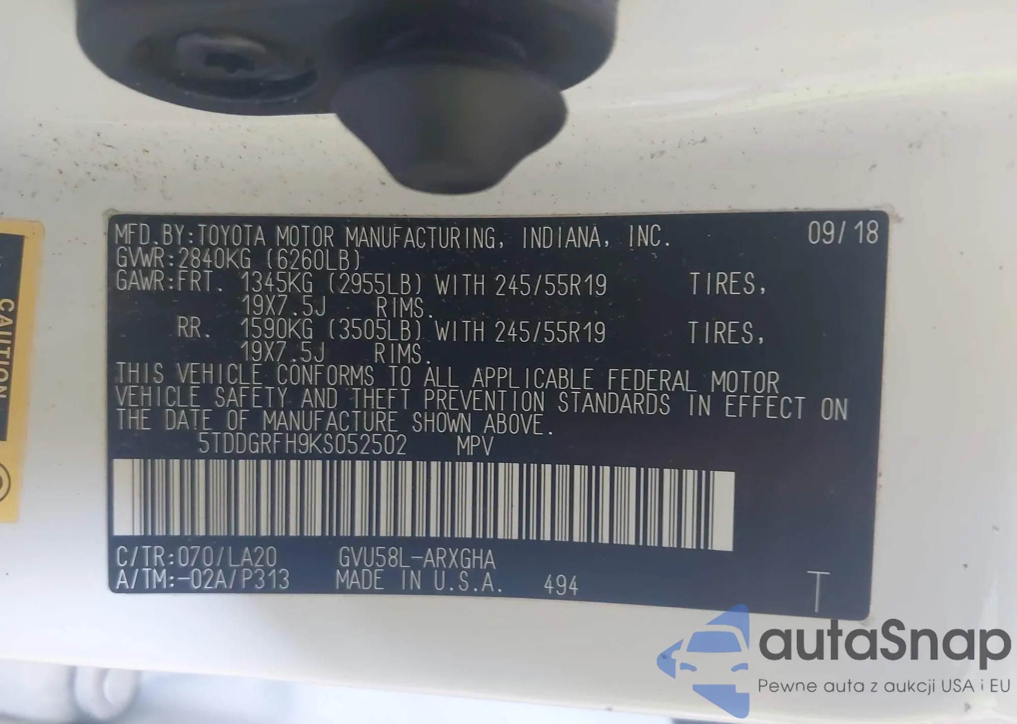 LOT: 42557387 VIN: 5TDDGRFH9KS052502