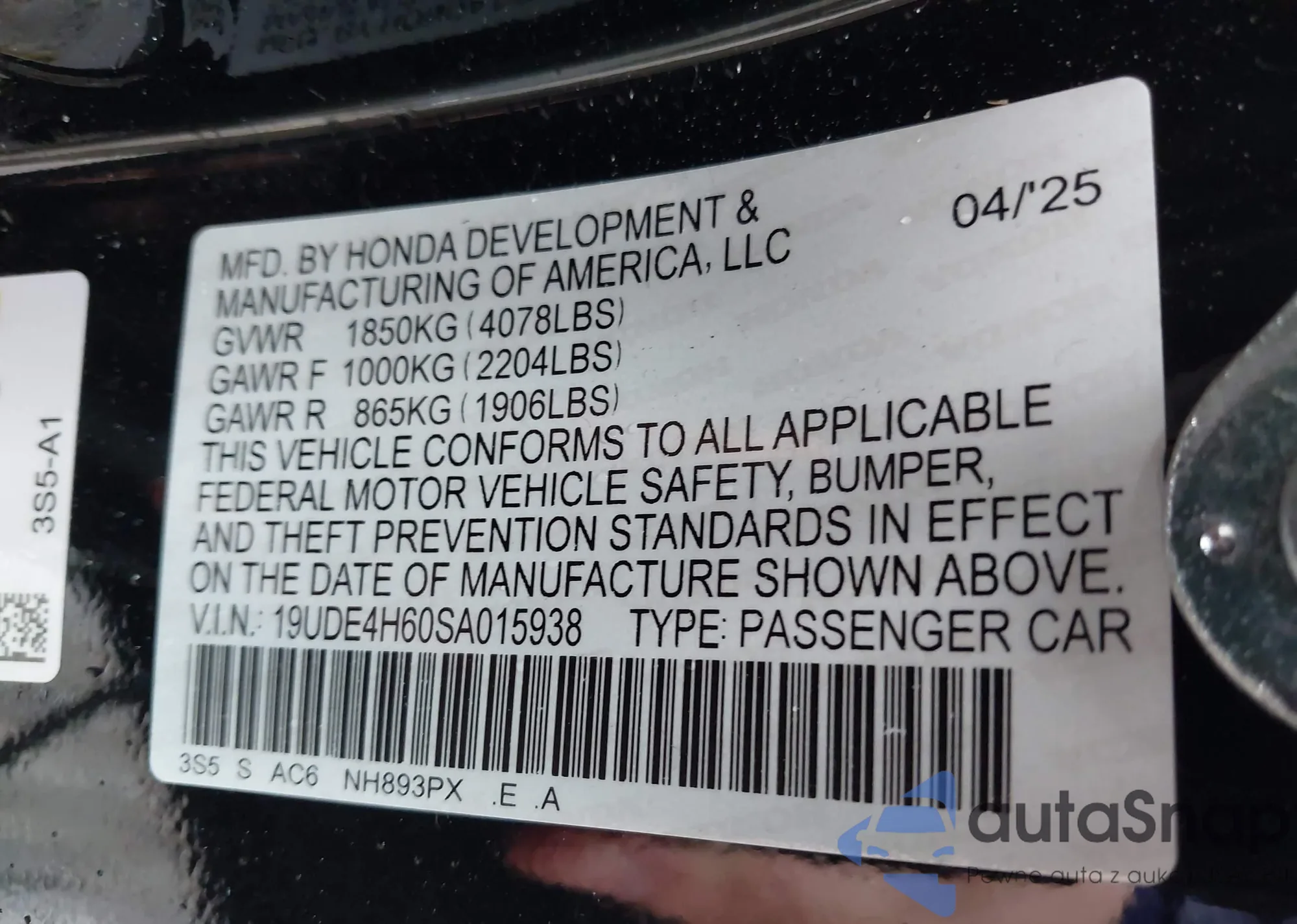 • VIN 19UDE4H60SA015938