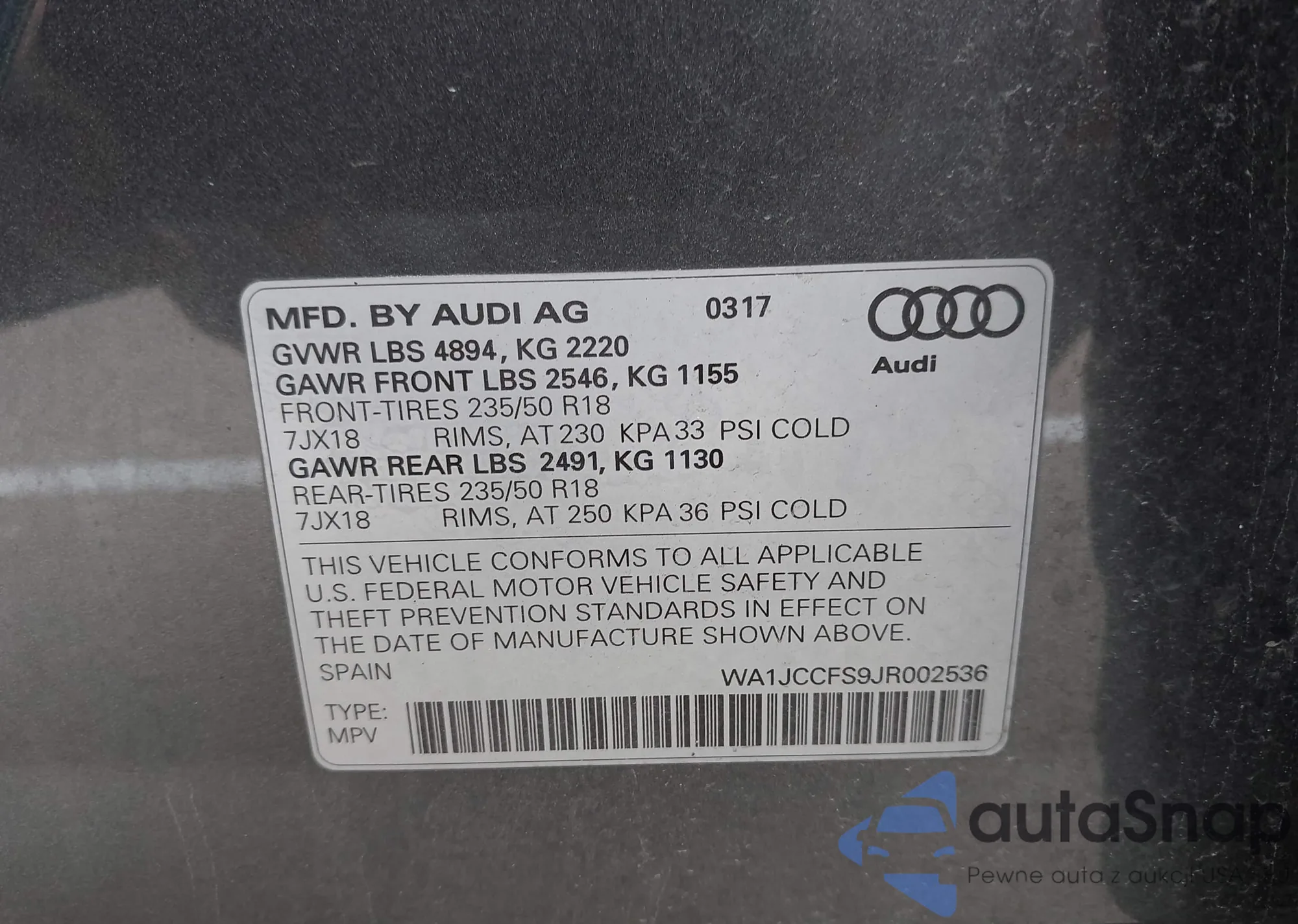 LOT: 42447068 VIN: WA1JCCFS9JR002536